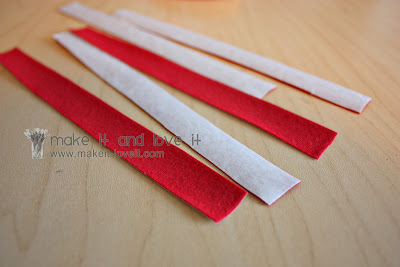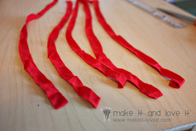 I first ironed on some Heat ‘n Bond (double sided adhesive) to a big chunk of the red knit. (from the old red tshirt I used above, remember?) From that, I cut strips of red that were 1/2 x 6 inches.