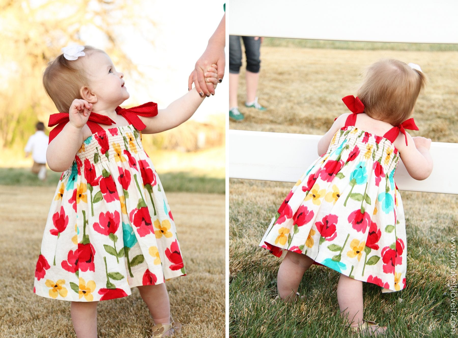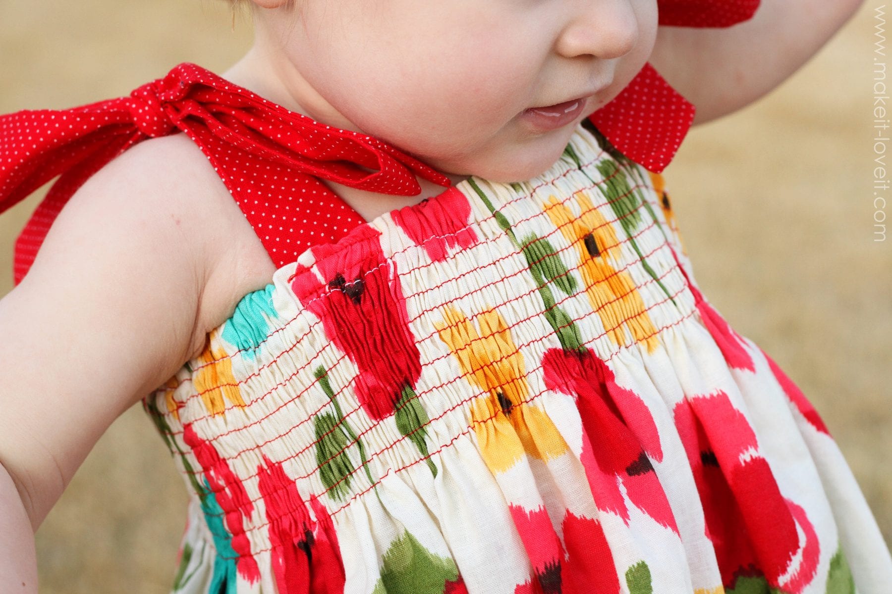 The dress is just a shirred tube of fabric. With some attached straps at the top. I first created a casing at the top, then shirred about 9 rows with elastic thread below that. Then I threaded the elastic through the casing, cinched it up, and steamed it to shrivel everything up. Then I created some narrow red tubes of fabric, and sewed them right to the top of the dress for the ties. (And as a point of reference, the measurement of the tube all the way around, was about 3 times the measurement of my baby’s chest.)