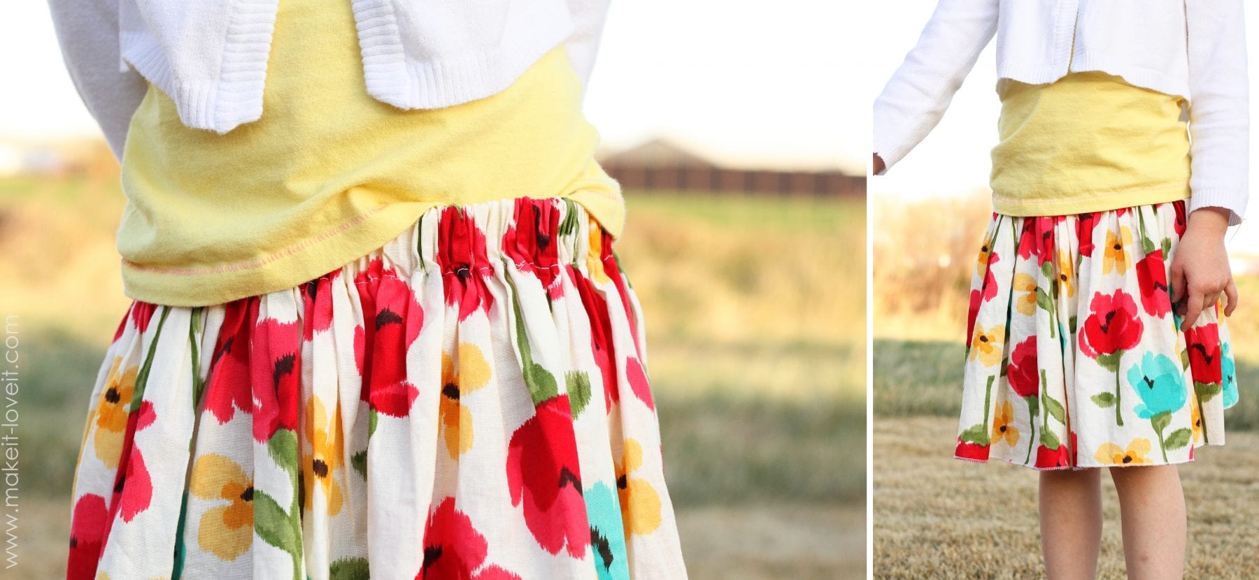 And for the skirt, I was going to shirr it just like the dress above (and the pattern in my shop)……but I ran out of elastic thread. So I just made a very basic skirt. With plenty of fabric so that it would be nice and full. And twirly. I used a piece of fabric that was 4 times as wide as her 20 inch waist. (Whereas I generally double the width of something when I want a basic gathered look.) Then I serged the top and bottom, folded over the top an inch and created a casing for the elastic…..and left the bottom alone (because it was serged). **TIP: If you are gathering in a skirt that is 4 times the measurement of the waist, be sure it is very thin fabric. Otherwise, the bulge of that much fabric will be way too bulky at the waist.Â