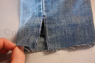 Then, I cut slits in the side that went up 1 1/4 inch plus another inch so that there would be little slits in the side after they were completed. (Also, this helps the hem lay a little better because pant legs usually aren’t straight up and down. Many styles go in a bit at the knee, making it harder to hem. But the slit helps with that.)