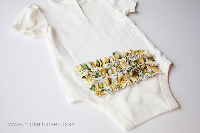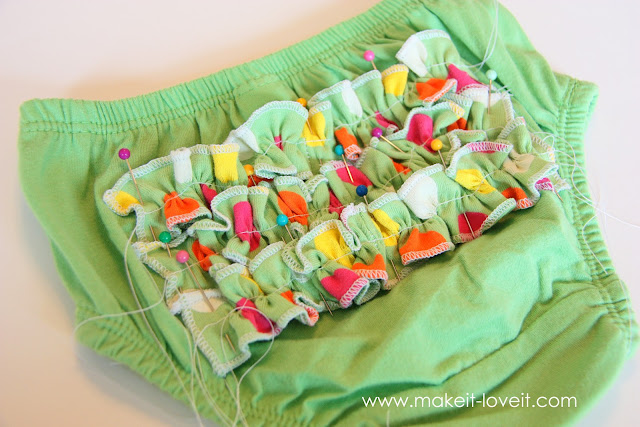 For the bum, I ruffled up some woven cotton strips, the same way I did above, and attached it right to the bum of the onesie.