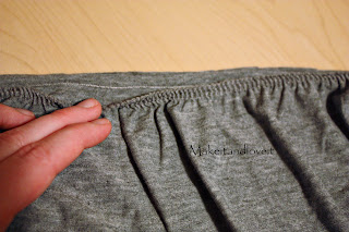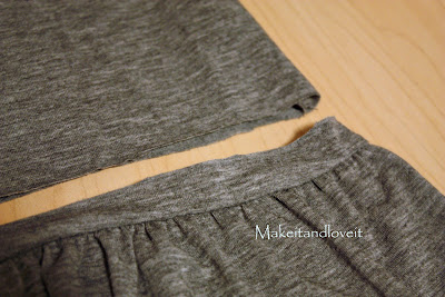 here, but made a basting stitch right down the center of my strip. Then I gathered my strip and pinned it to the bottom of the dress, covering the seam where I attached the dress back together. Then I sewed a seam right over top of that basting seam, attaching the ruffle to the dress.