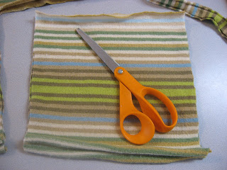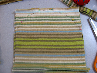 So lay out your sweater and measure a 9 inch by 9 inch square. (This is what I needed for my head…….but measure your own head and remember that your sweater stretches.) Make sure you are cutting through both layers of your sweater, as you will need two pieces.