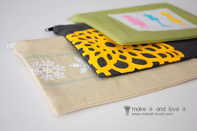 here), you’ll see that I made these little zippered pouches, using iron-on vinyl…….which was cut using the Silhouette. I also used the Silhoutte to cut out a template so that I could use craft paint on that little green pouch.  Worked great!