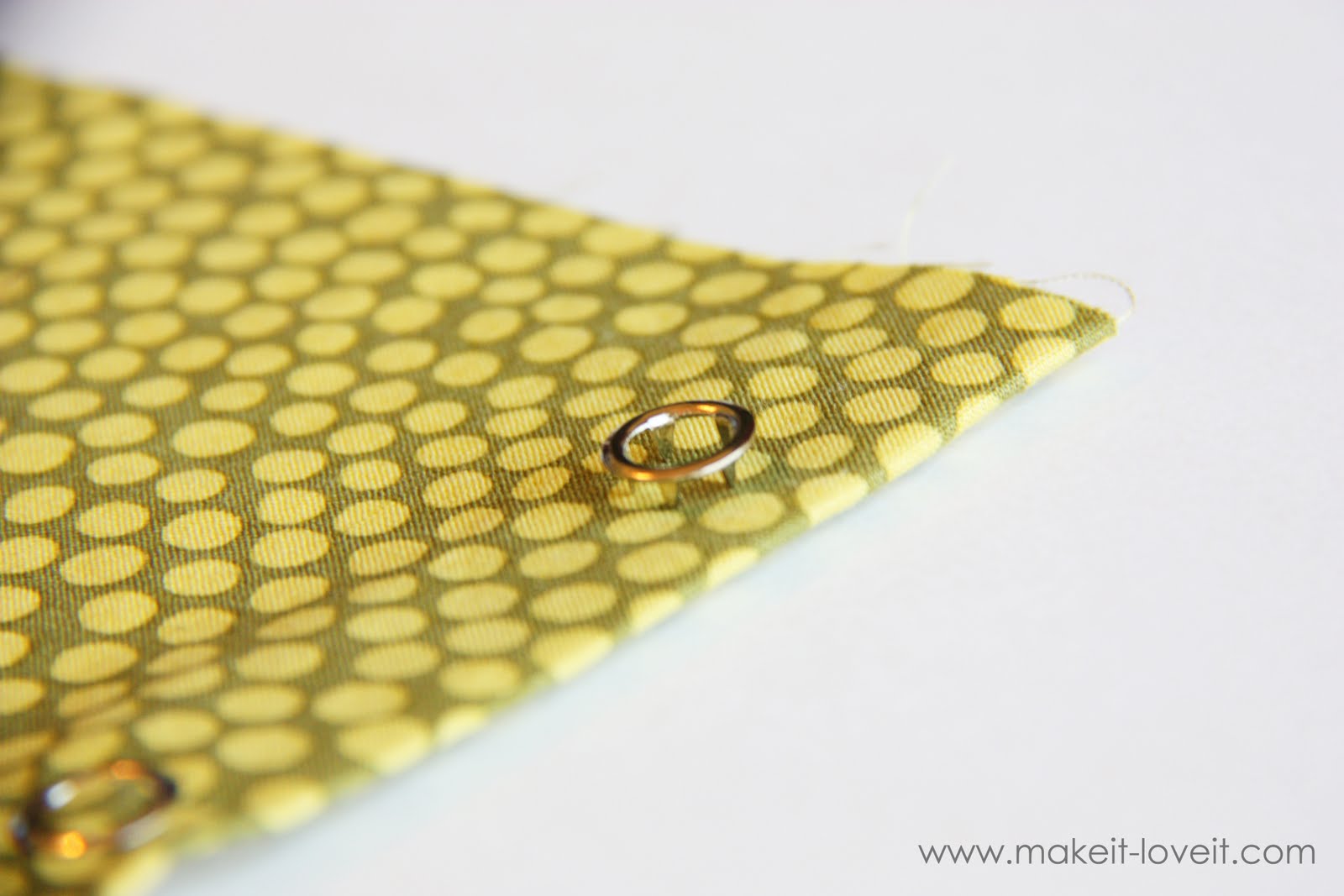 Another option is to buy sew-able snaps. They come in plastic or metal and have little holes around the edges of the snaps so that you can hand stitch them in place. These are great if you don’t want to metal ring to show from the outside of the fabric.