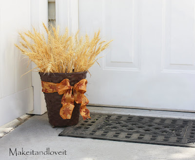 And then I tied some ribbon around the basket. And put some tall wheat stalks inside. Don’t have any wheat stocks laying around?!?! :) Check out your local craft store for any sort of tall replacement in the floral department. There are all sorts of funky/fallish/tall items to put in your basket. (I have no clue what any of them are called…..just browse around a while.)