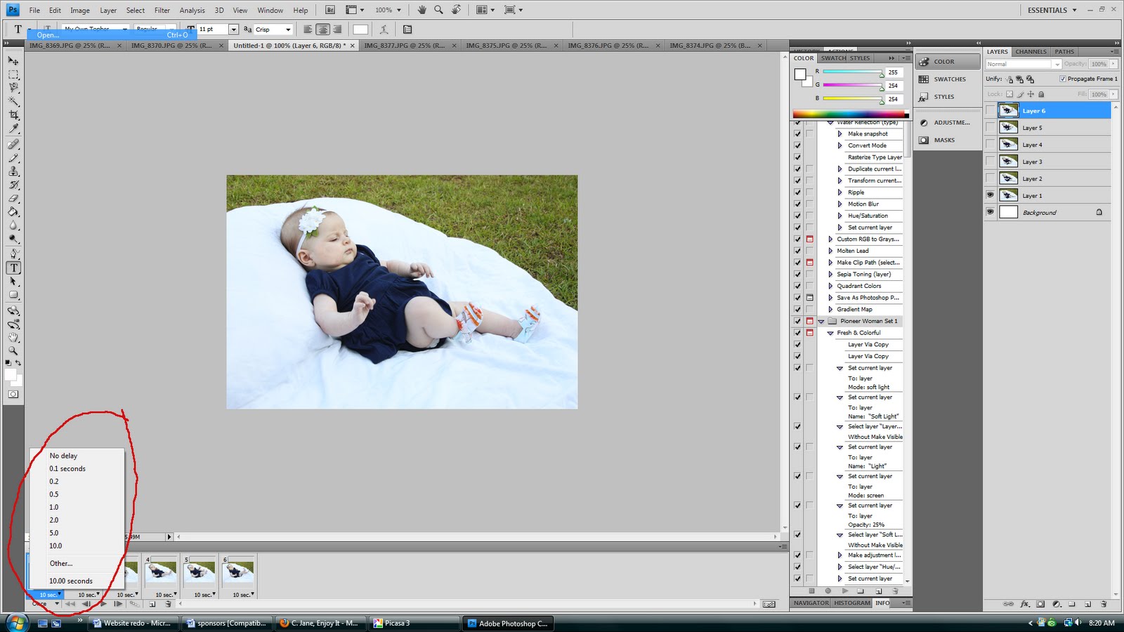 Continue until all your animation boxes have their own image in them. Then click on the time button below each image in the animation section. This will allow you to choose how long each frame will show in the animation. I chose .3 seconds originally, but then changed to .4 later. Also be sure that the button below the images says “forever”…….meaning that it will repeat the frames continuously. Press “play” (the triangle) below the little pictures to see if it’s how you’d like it.