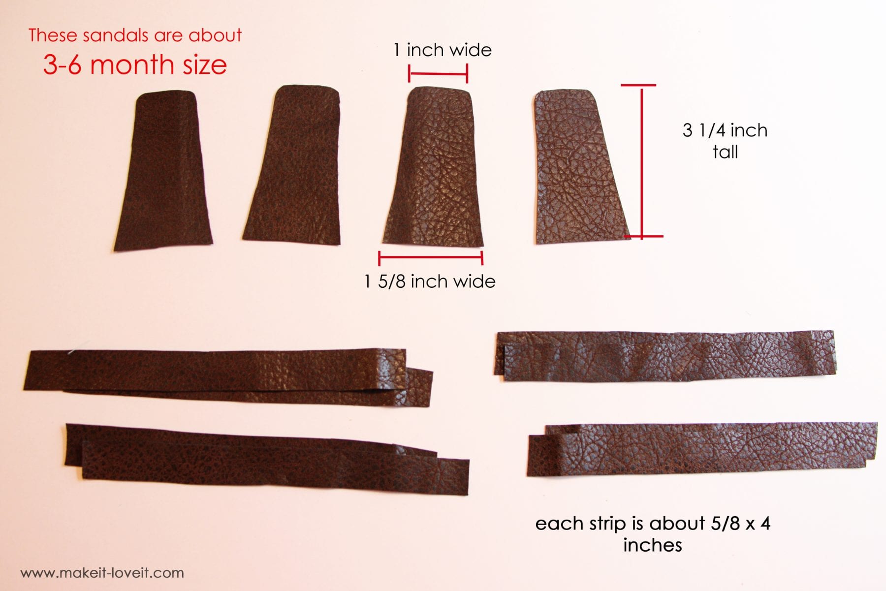 Now, you’ll need to cut out a sort of rectangle piece that will go on top of the foot.  The top edge is rounded and more narrow and the bottom edge is tapered outwards and is just a straight edge.  It will be rounded and trimmed later on.  The length of this piece will be longer than you think you’ll need…….because those baby feet are rounded and chunky.  So this piece will go up and over the top of the foot, so you’ll need enough length to go up and meet the ankle.  You’ll need 4 of these pieces.  You will also need 8 long strips to use for the weaving. (My sizes and measurements are shown below for my 3-6 month sandal size.)