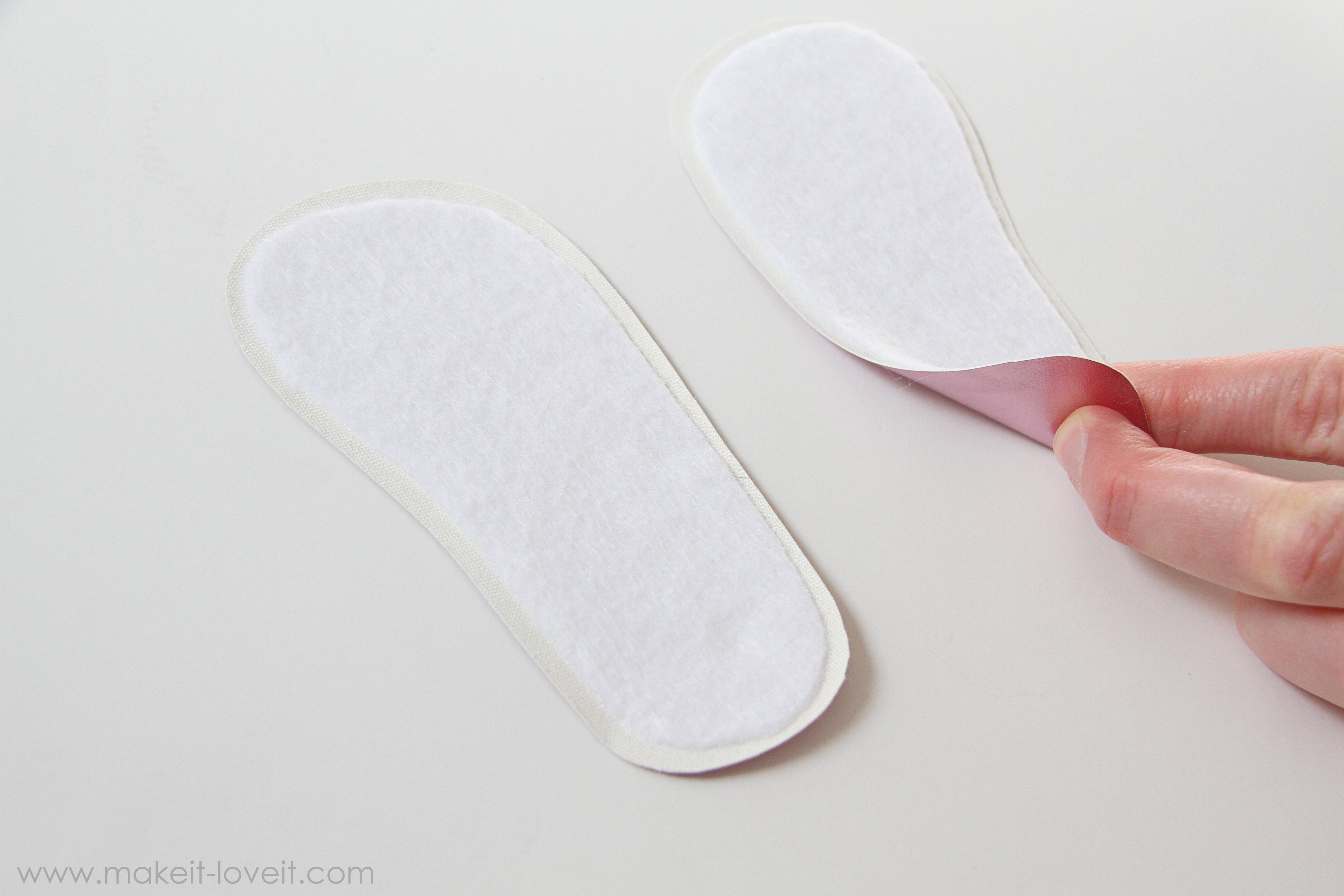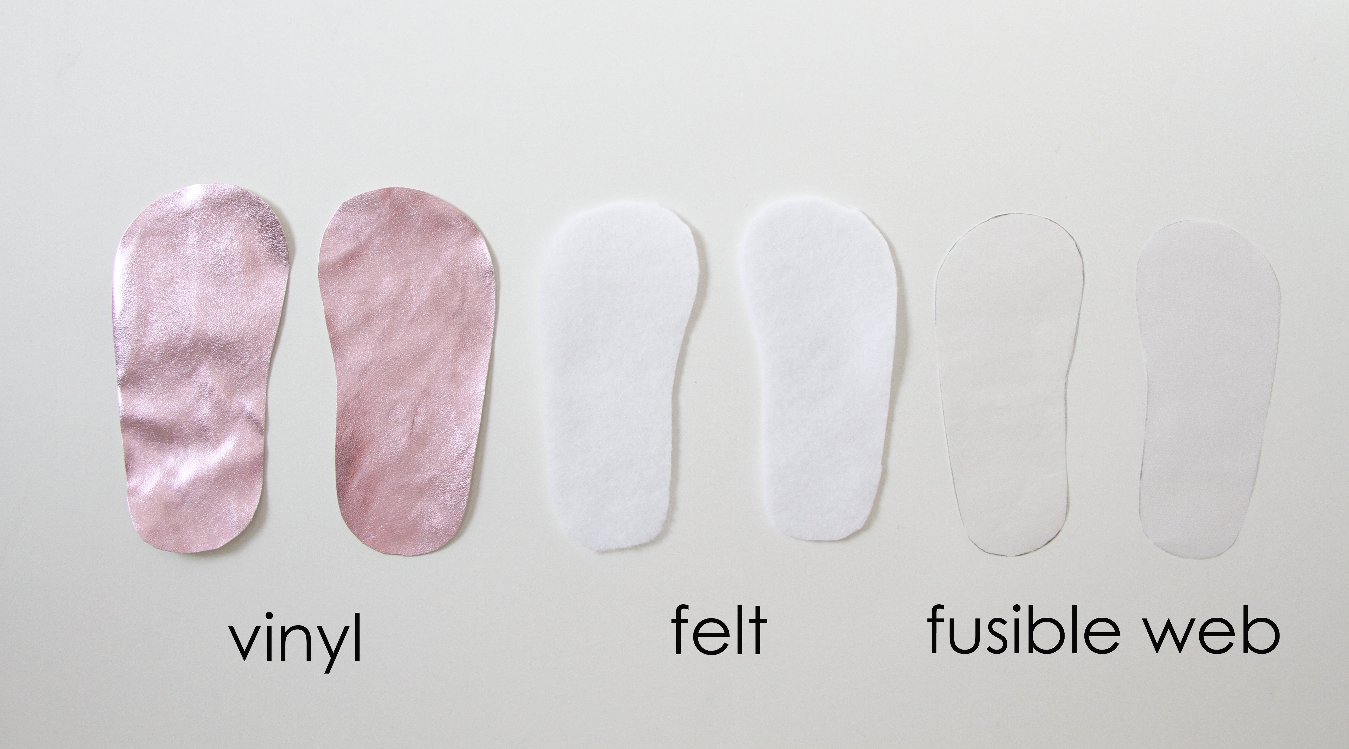 Next, trace around a pair of shoes (or sandals) that fit your subject. Then let the child stand on top of that traced drawing to see if that will be a good fit for the foot. Adjust as necessary. Remember, you’ll want a little extra room around all of the edges for the little seam all the way around. Then, for one sandal, you’ll use that pattern piece to cut out a top piece and a bottom piece of vinyl that are cut opposite each other so that they can be placed with wrong sides together. Then cut another pattern piece that is an 1/8 of an inch smaller around all the edges than your fist pattern piece. Then cut 2 pieces of felt, and 2 pieces of fusible adhesive/web (what’s this? go here). You make these smaller so that when the sandal sole is sewn together, you are only sewing through the 2 layers of vinyl…….not the felt and adhesive.