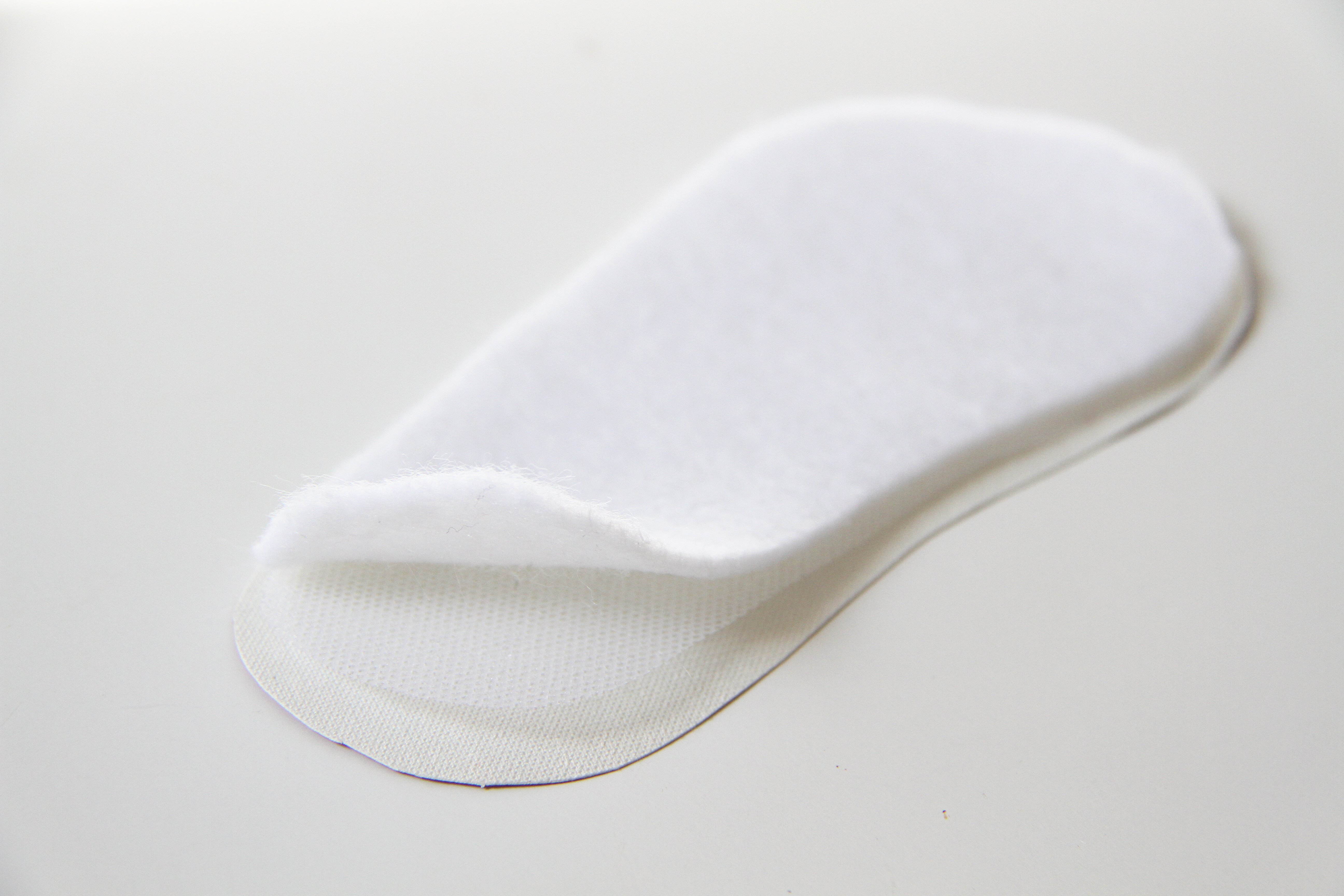 Next, turn one of the sole places face down, then place a layer of fusible adhesive/web down, and then a piece of felt. Iron the felt down until it’s securely attached to the vinyl. (Be careful how hot your iron is so that you don’t melt or shrivel up your vinyl.)