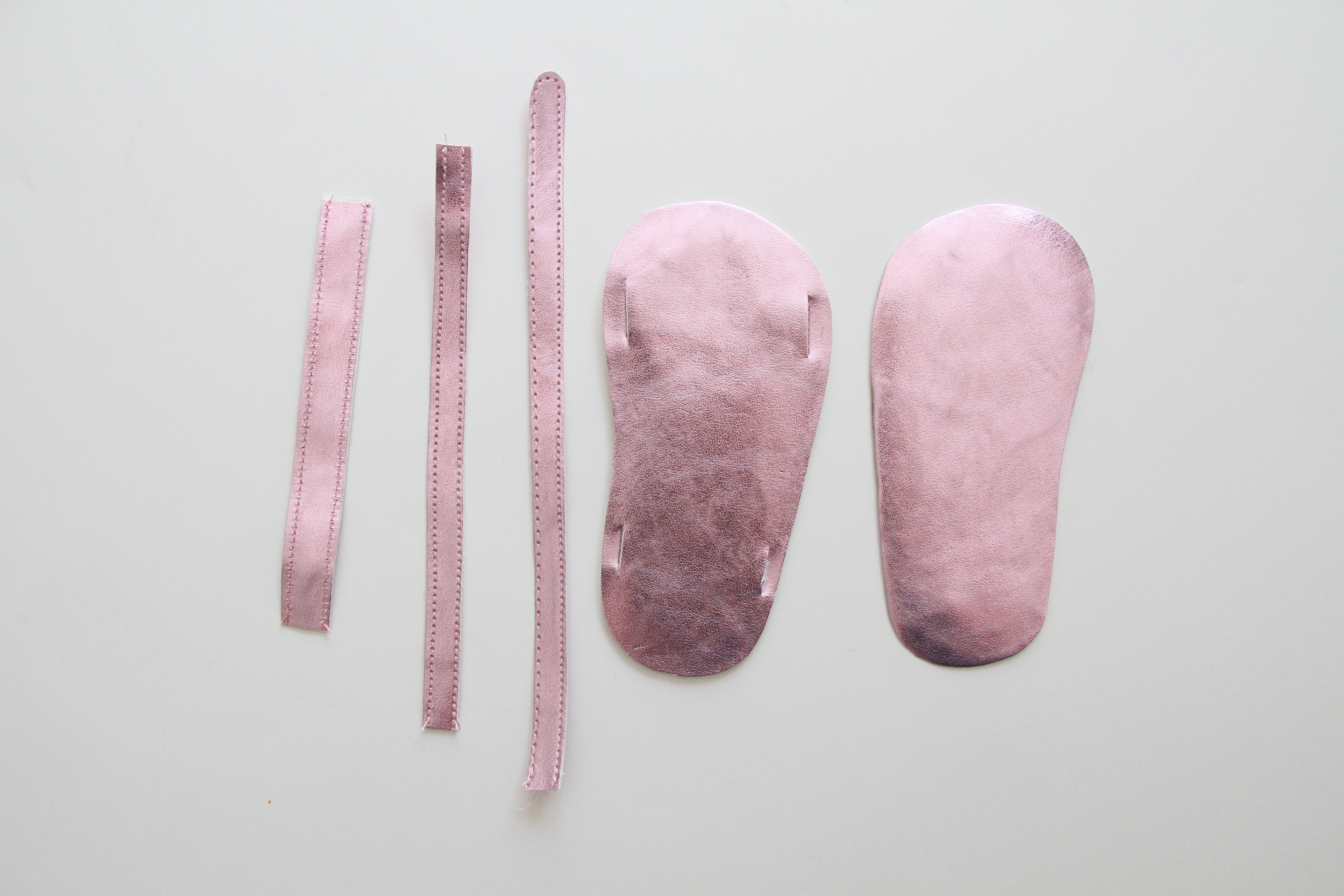 Next, you’ll cut some strips of vinyl that will be used for the straps of the sandals. And because vinyl usually only has the pretty color on one side, ach strip is made with two strips of vinyl, placed together with wrong sides together, then sewn along each side to attach them together. Everyone’s measurements will be different, depending on the size foot your subject has. But I will tell you what my dimensions are for my size 4 sandal for my 13 month old daughter. (Remember, you will need added length for each strap so that they can be tucked/folded under/etc. If you read on, you will understand better.)