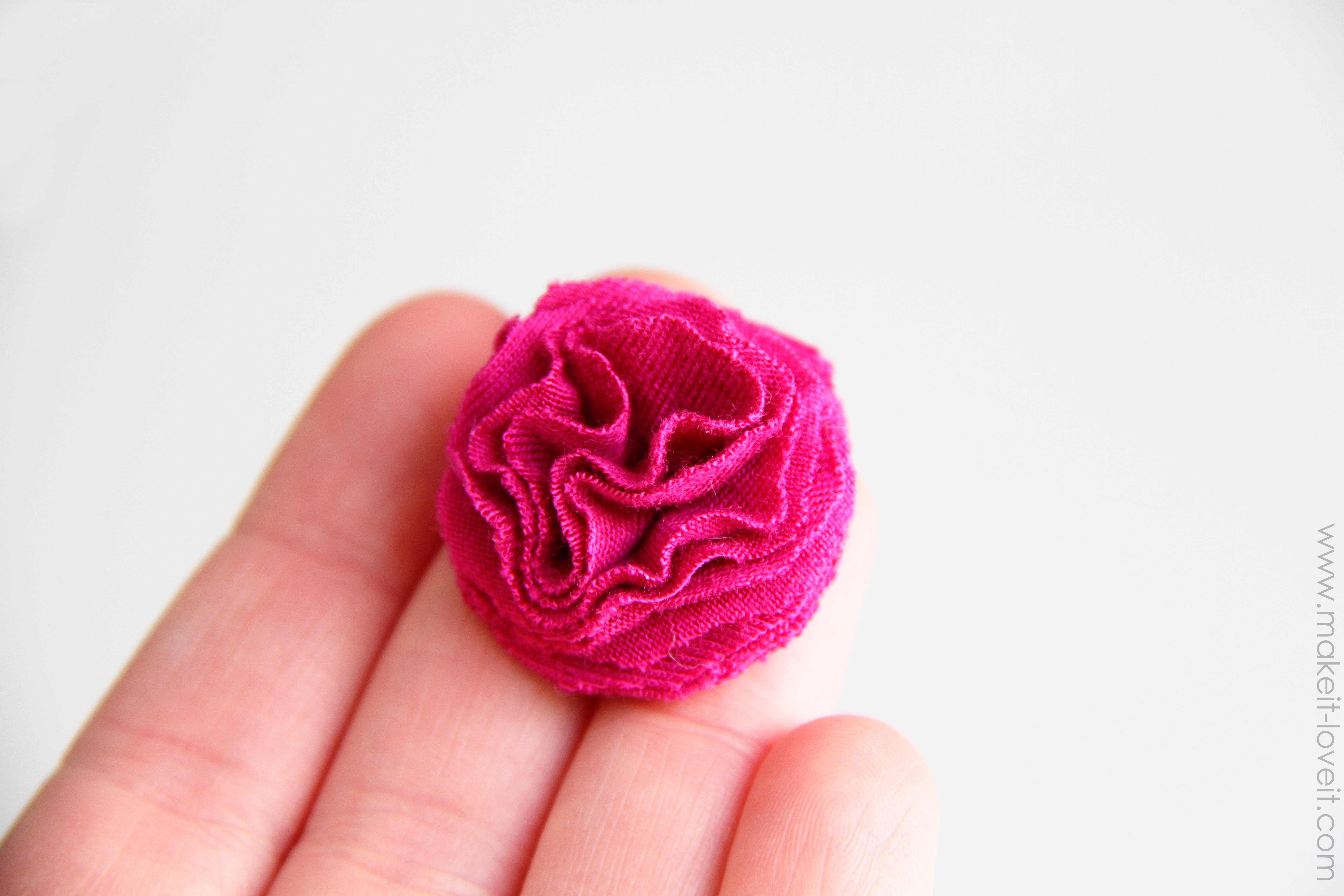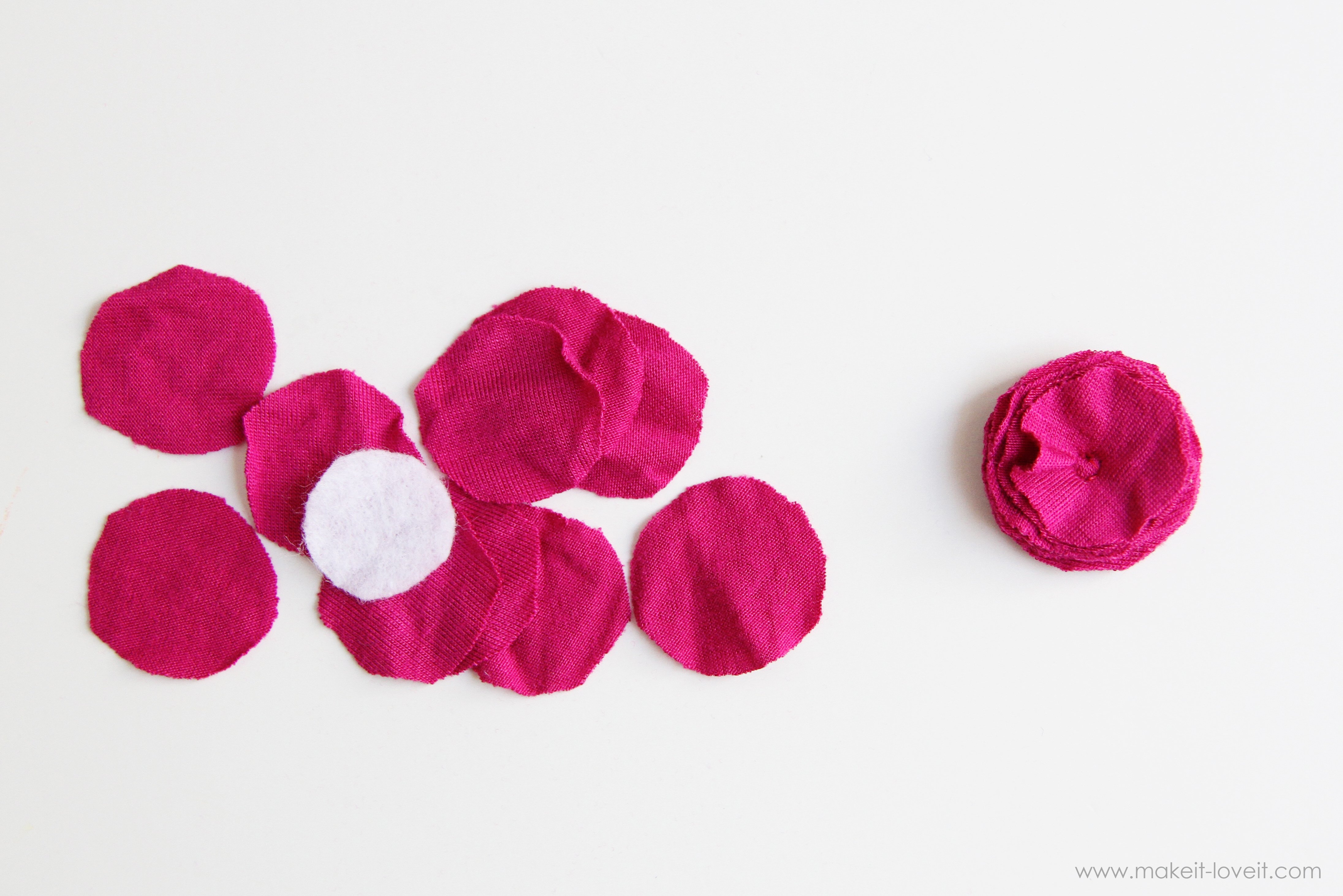 Now, time for the flowers. I cut up old jersey knits scraps from my knit scrap box to make them. I cut 10 circles for each circle (mine are about an inch in diameter). And remember, the circles don’t have to be perfect at all. Just eyeball it and then cut. Then, I cut one piece of felt that was slightly smaller than my knit circles, that I would use as the backing to each flower. Then I stacked all of the circles on top of each other and then sewed them together right in the middle, with the felt circle centered on the very back. (To sew them together, I lowered my stitch length really low, lowered my feed dogs, and then sewed a little circle right in the very middle. But I realized that’s not the easiest way for everyone. So another option is to just turn your machine stitch to zig-zag, decrease your stitch length all the way to zero, and then stitch several stitches. That will tack all the circles together.)