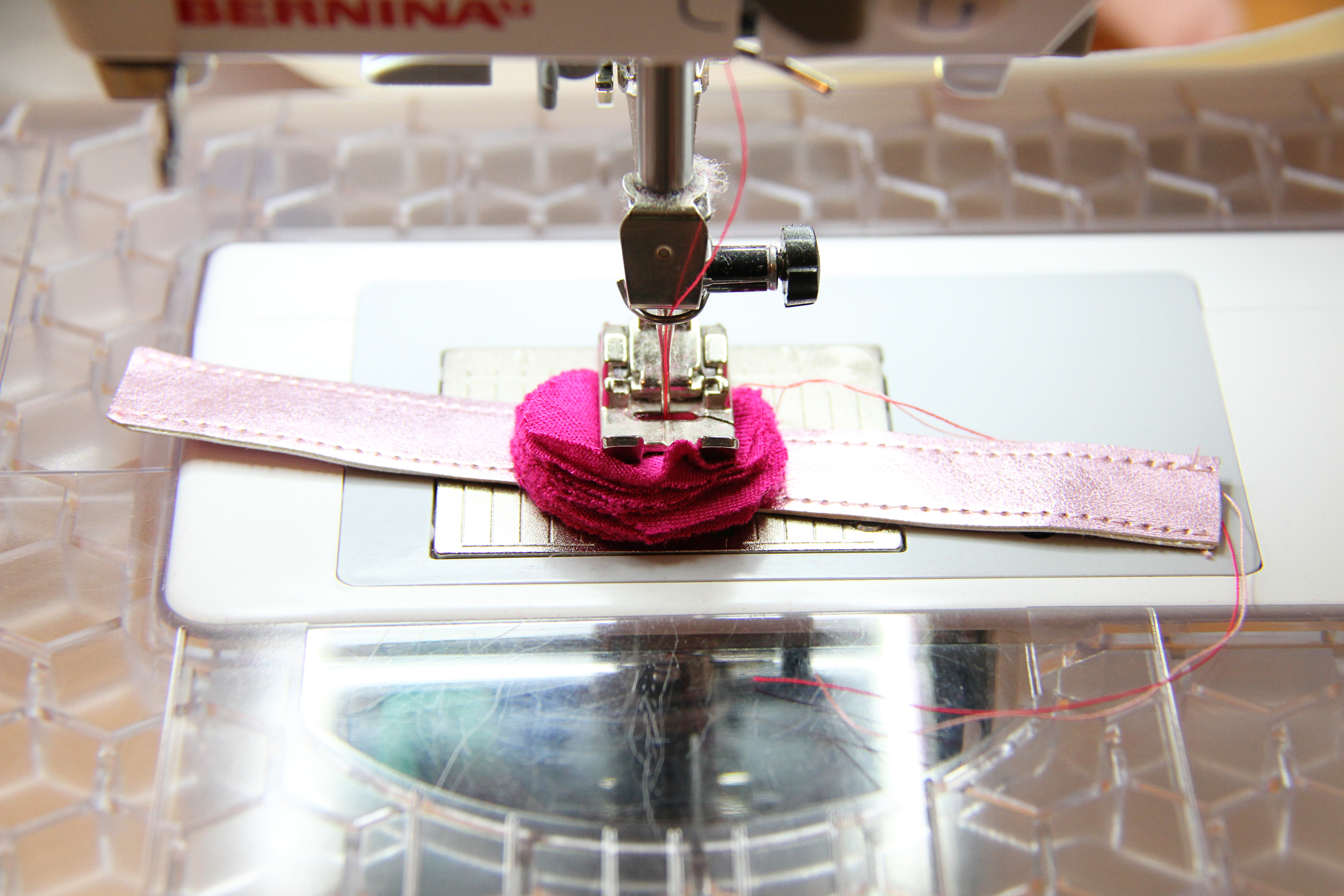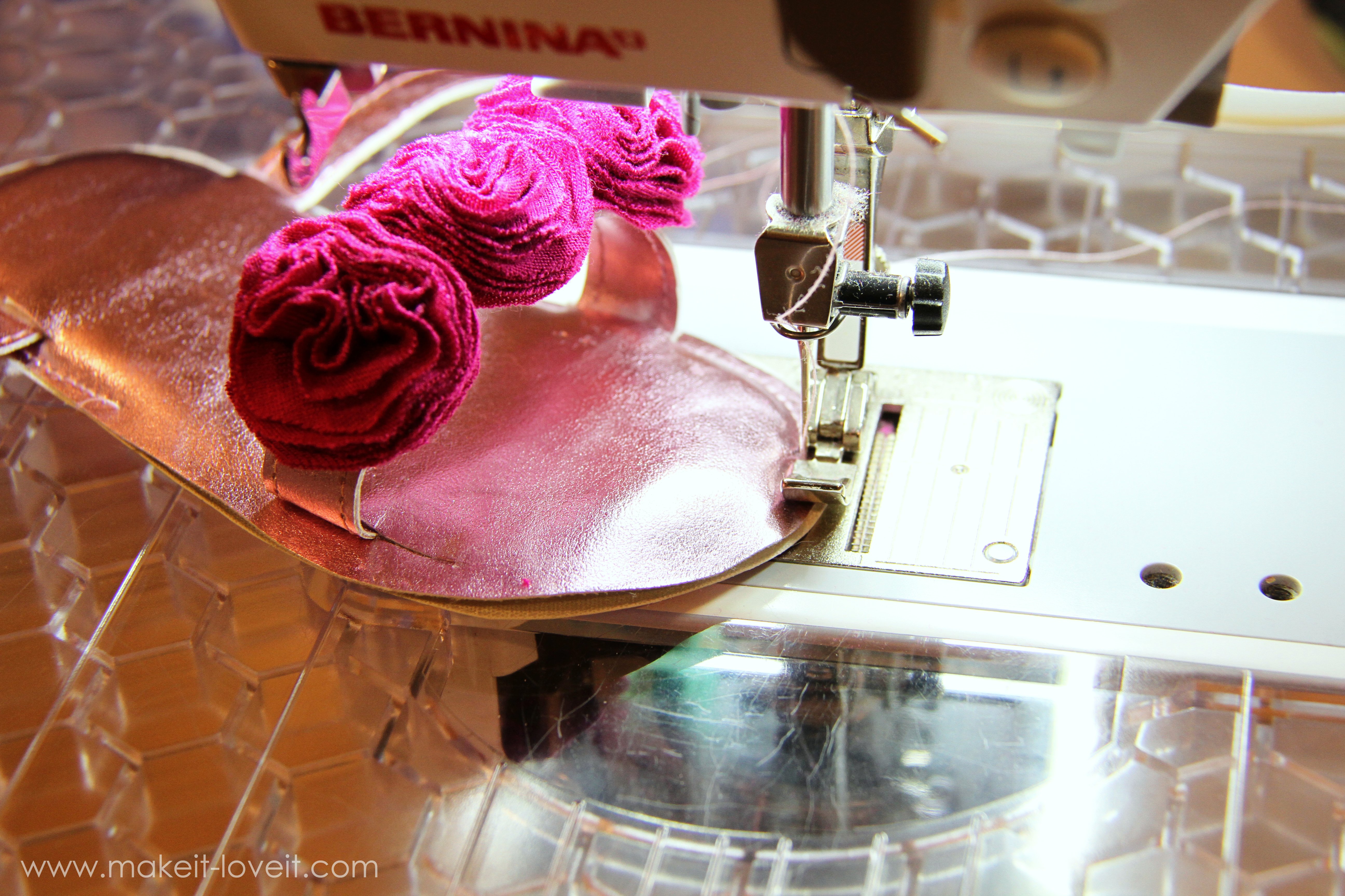 Then, flatten those layers back down again, remove the toe strap from the sole, and then stitch the flower down to the strap the same way you did in the previous step. Add two more flowers the same way.
