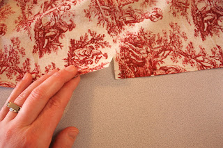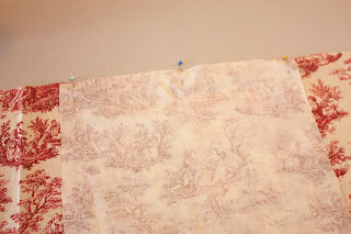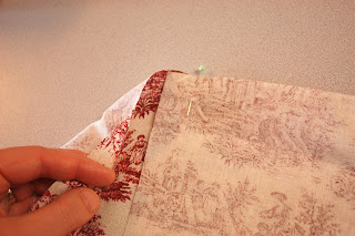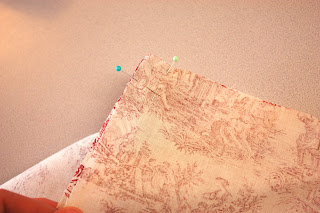 Then I folded the extra sides of the main piece down along the sides of the the end pieces and pinned them into place, making a nice corner with both pieces of fabric. (Man, this is hard to explain…..but keep with me. It’s not so hard to do!!)