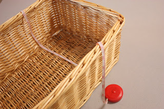 Then measure the dimensions of the ends of your basket. The width of my ends were 10 inches and I added a 1/2 inch on each side for a seam allowance, making it 11 inches. And the height of my ends are 6 inches. So I added a half inch to the bottom for the seam allowance, 2 inches to the top to be folded over the edge, and then another 1 1/2 inches to make the casing for the tie.