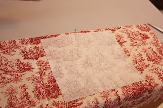 Then I found the center of my main piece (on the 29 inch side) and marked it with a pin. And then I found the center of one of the end pieces (on the 11 inch side) and put the two pieces of fabric together, with right sides together.