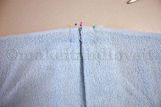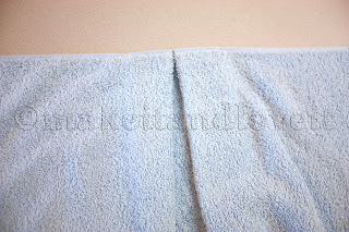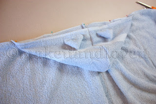 Then, lay the main section of your towel down, with the pleat face up. Lay the bottom of the hood against the main section of the towel, with right sides together. Make sure the center of the pleat is lined up with the center seam of the hood.