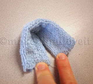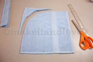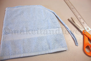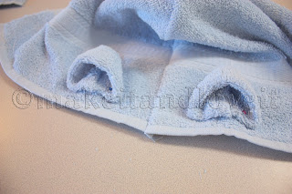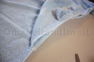 Then, fold your hand towel in half lengthwise. You’re going to be using the finished edges of the hand towel as the front finished edge of the hood, so don’t cut it off in this next step.