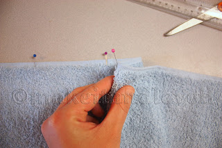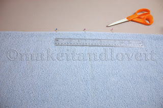 Fold your towel in half lengthwise and mark with a pin. Then measure out 4 inches on either side of the pin and mark with more pins.
