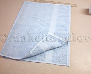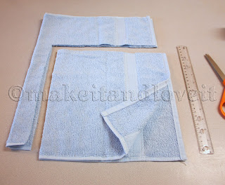 Measure 10×10 inches, and cut out your 2 squares from the hand towel.