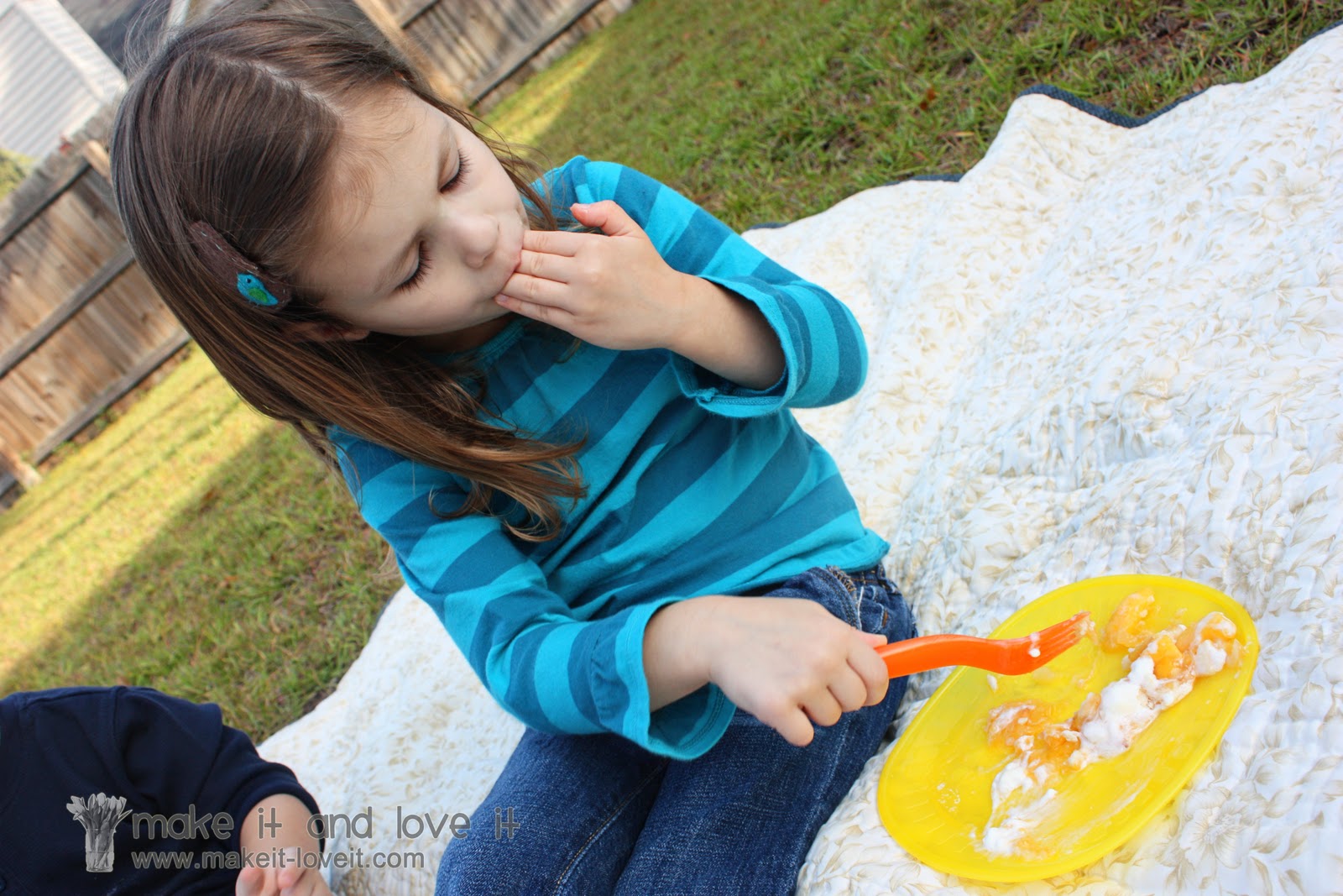 And since the weather is now extremely pleasant here in Georgia, we flung a blanket out on the back lawn, and all enjoyed a little peach pie picnic.