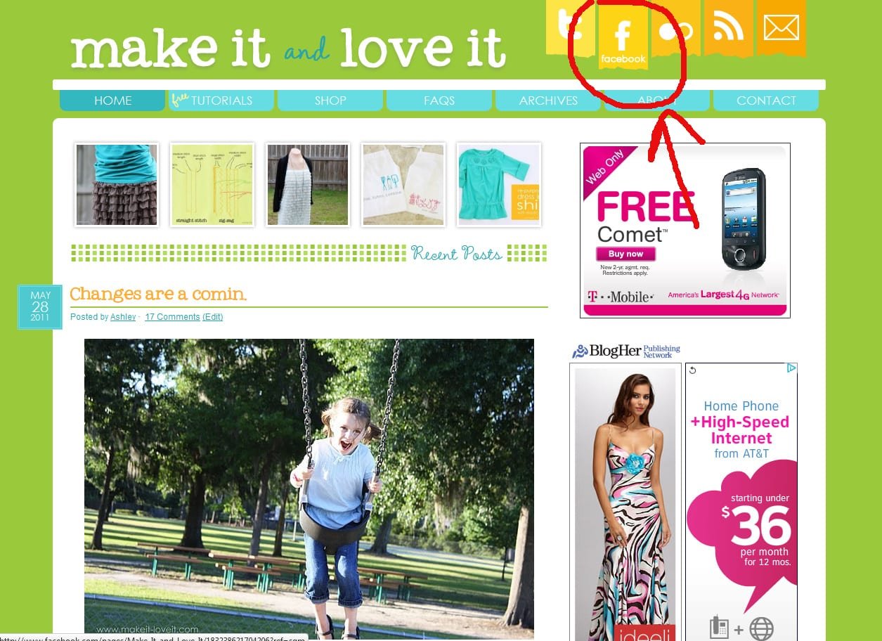 Up at the top, you’ll find all of those social media links. Twitter, Facebook, Flickr, RSS feed, and to subscribe by email. If you hold your cursor over them, they drop down and bit and show what each symbol is called.