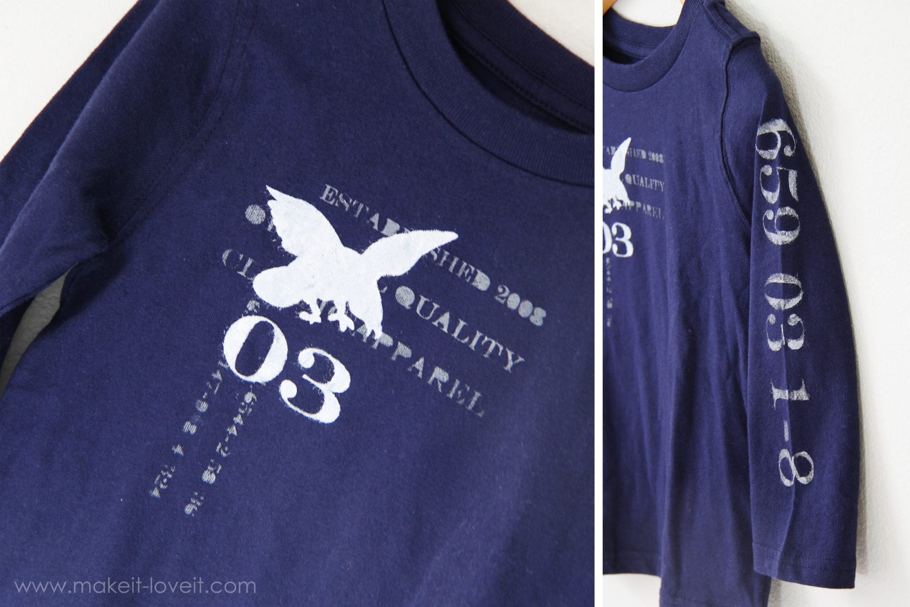 After that dried (I used a hair dryer to speed it up), I placed my second stencil on top and applied a thicker layer of white paint, making the eagle and ’03’ stand out a bit more.