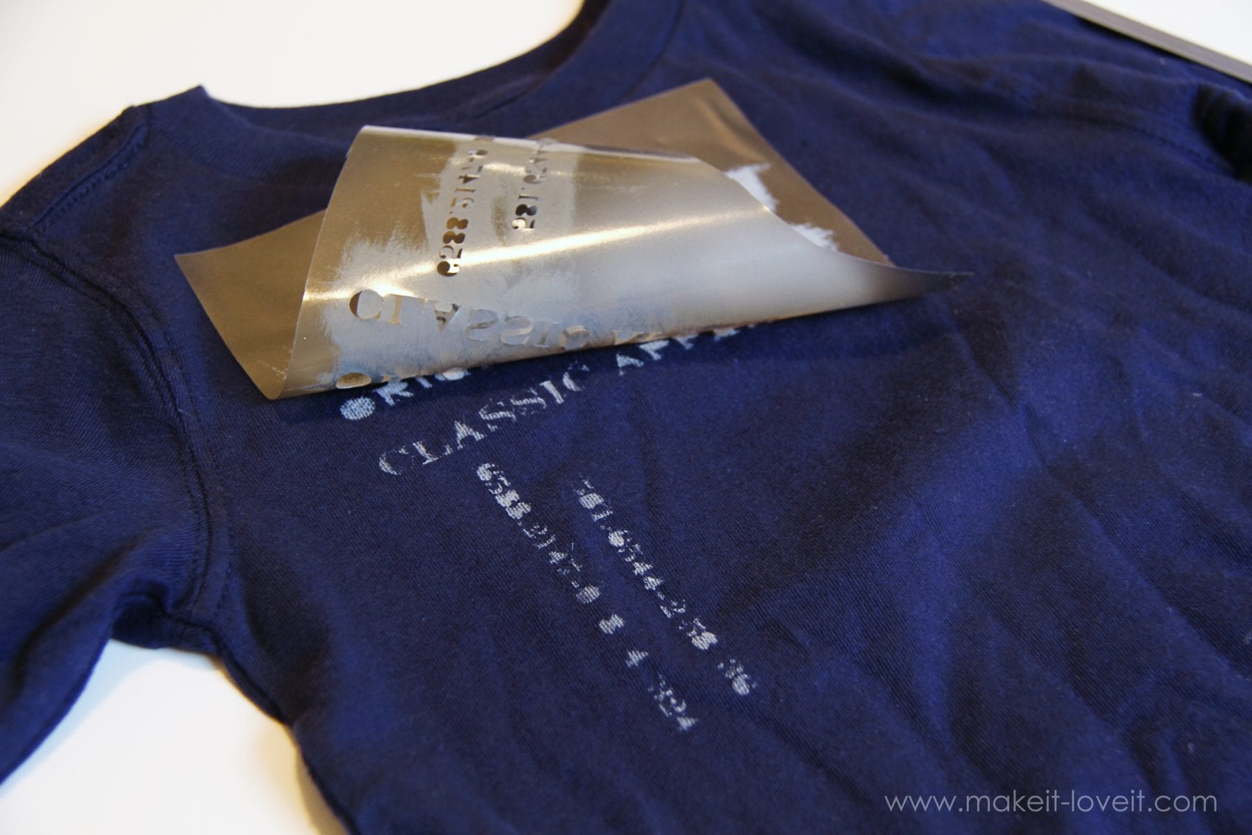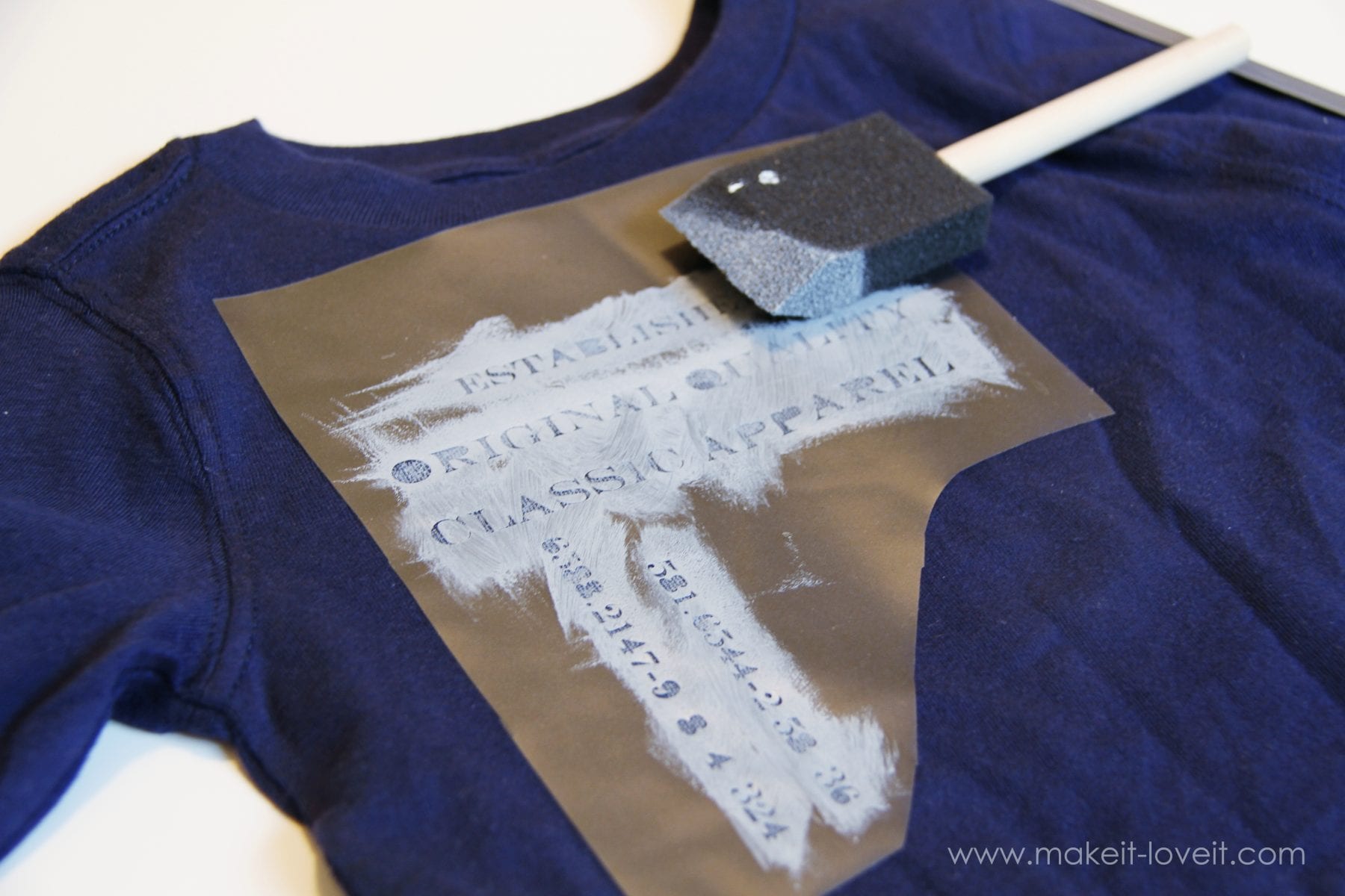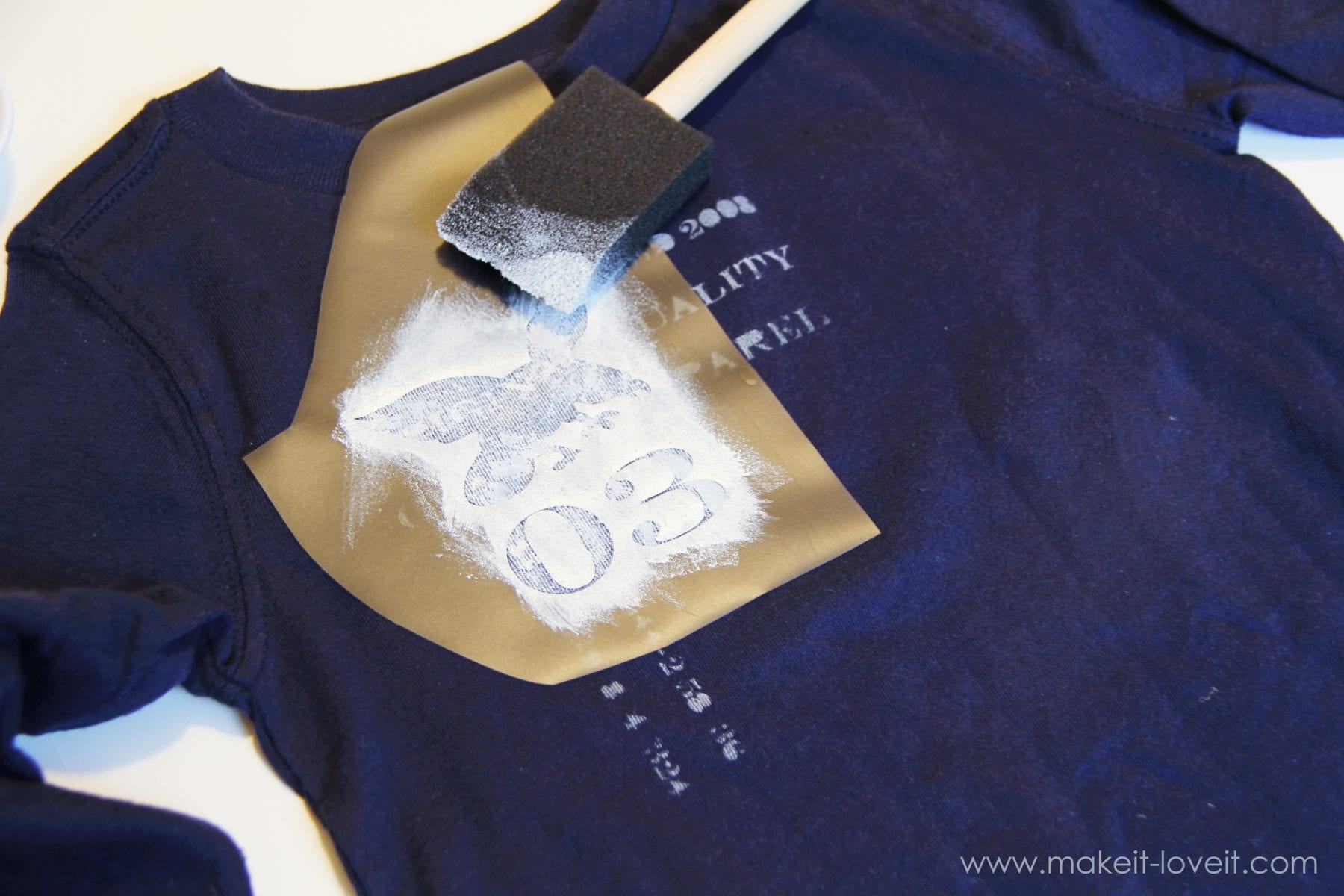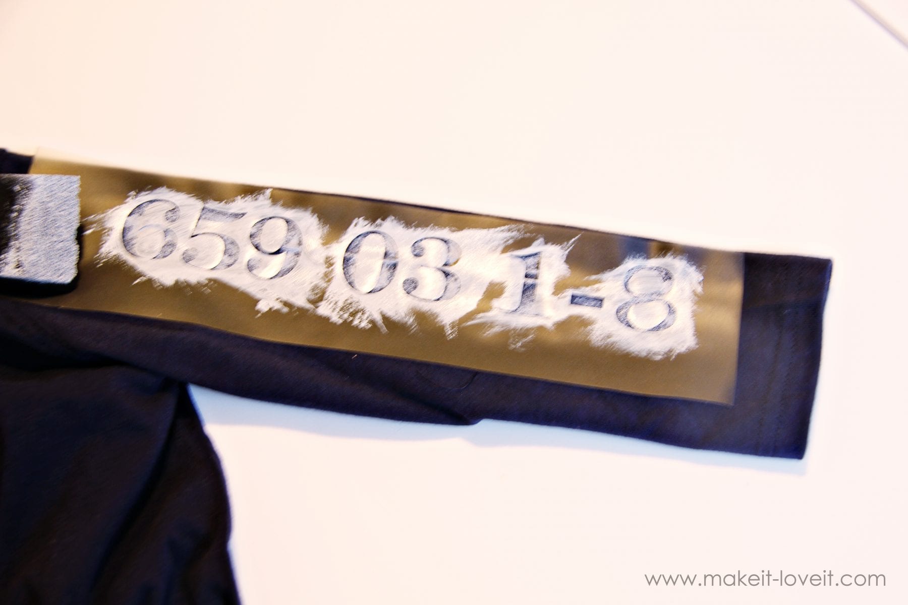 I removed the numbers on my first stencil and placed it down on my shirt (I put a few layers of newspaper in between the layers of Tshirt so that it wouldn’t leak to the back) and then started dabbing grey (mixed white and black) fabric paint onto the shirt. The stencil is sticky on the back so it stays put while dabbing. I only applied a thin layer because I wanted a faded look to it.