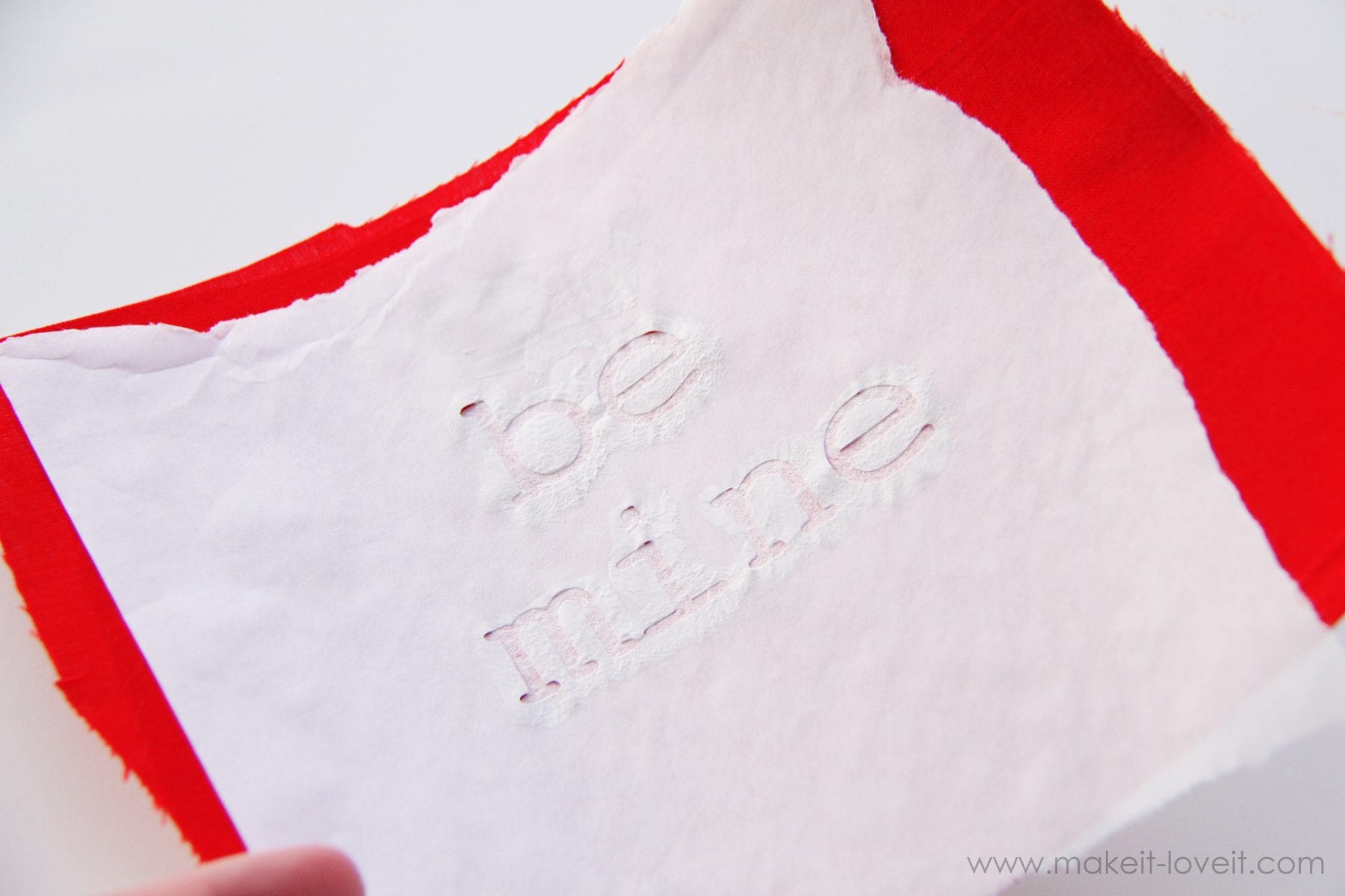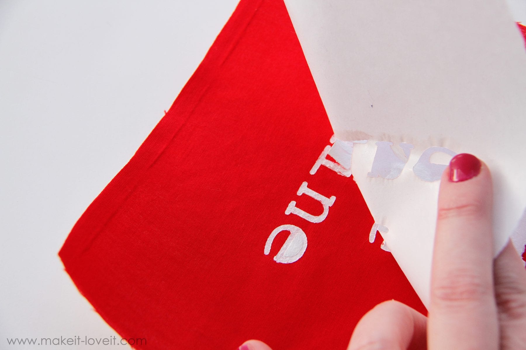 Now, you could cut your heart out first and then put your lettering on or do it the HARD way like I did and put your letters on first. Ack! Either way, you’ll need to cut out your letters out of freezer paper (more info on freezer paper here), with the shiny side of the freezer paper facing down. You can draw the letters out on freezer paper and cut them out with an exacto knife or cut them out with your Silhouette machine (or other craft cutter), if you have one.