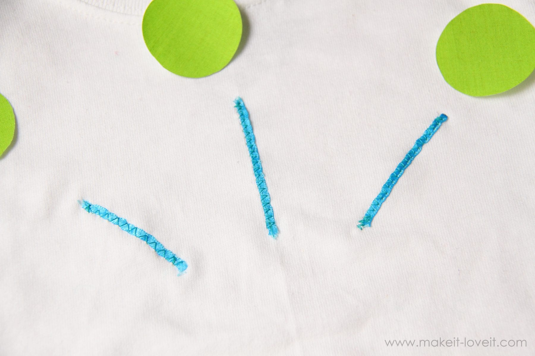 Next, place the monster shapes down where you’d like them on your shirt. Then lay little pieces of ribbon down to connect the eyeballs to the monster body, tucking the ends under the eyeballs and body.