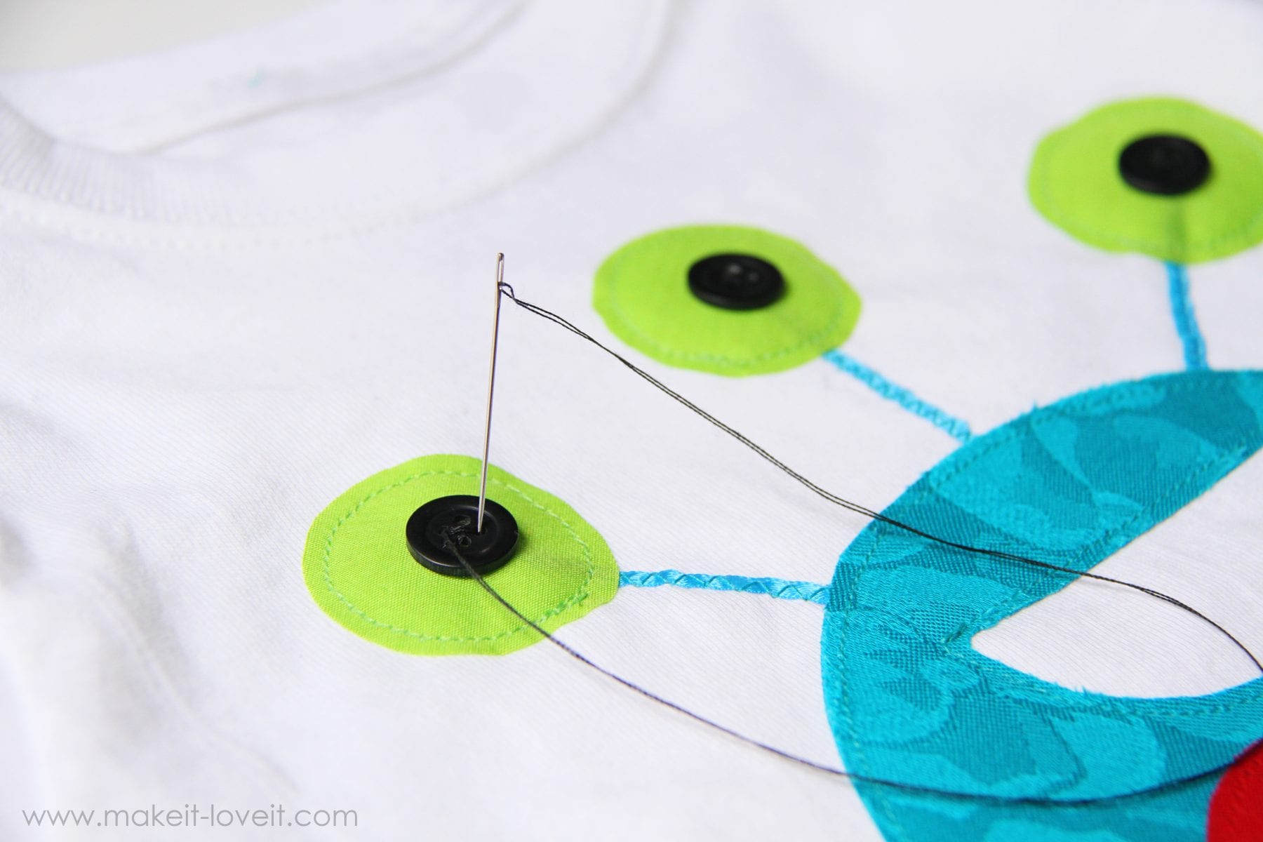 Then, hand sew (or machine sew) some buttons onto the center of each eyeball.