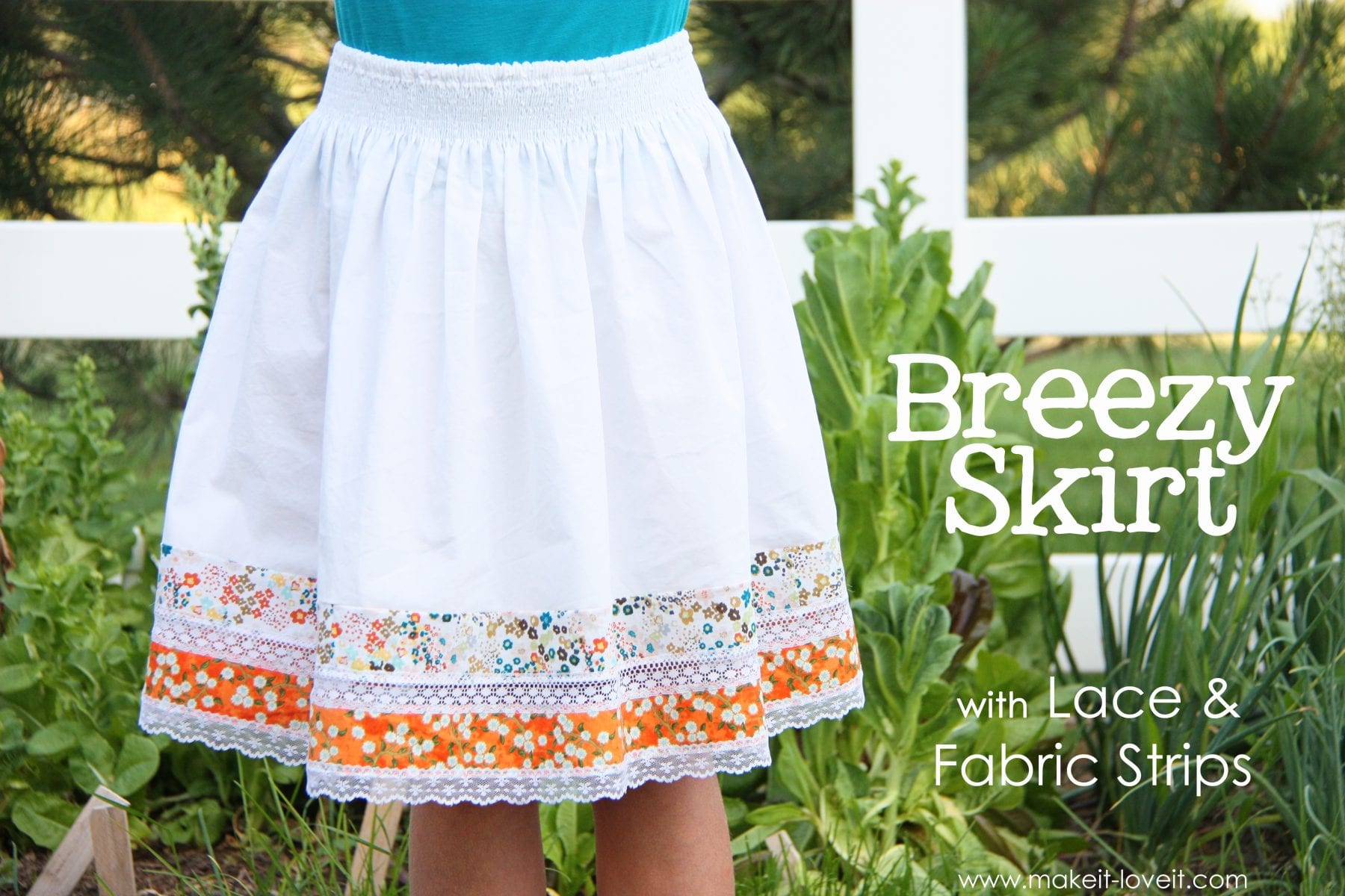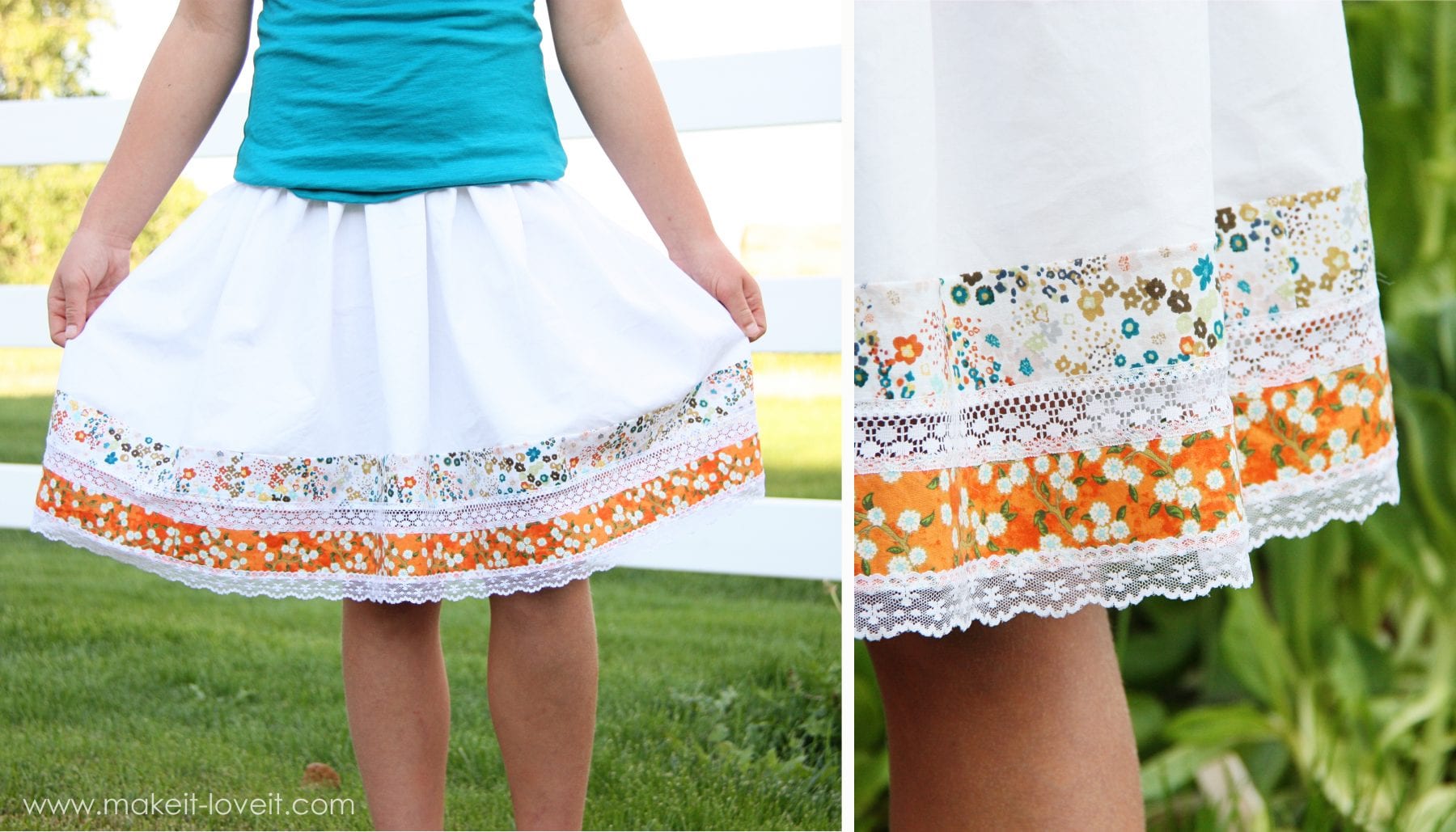 First of all, see if you have an old boring skirt you’d like to transform. Or pick out some new fabric to make a brand new one. And you can make a skirt using my Lily Skirt pattern from my shop here or just make a basic skirt with an elastic waist band, like here. (If you’re making your own skirt, you’ll need to make the main skirt shorter than normal because you’ll be adding the fabric strips and lace to the bottom.)