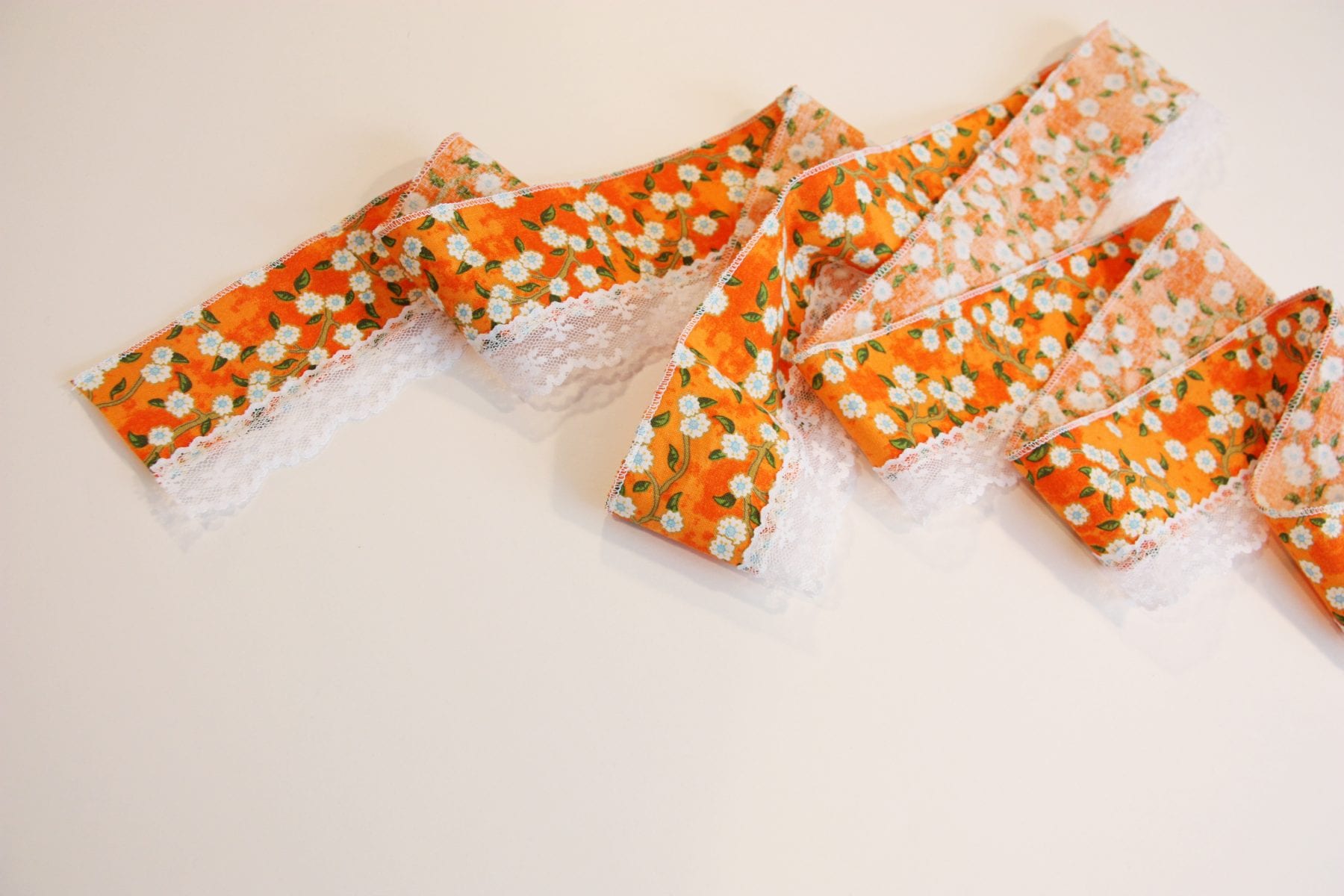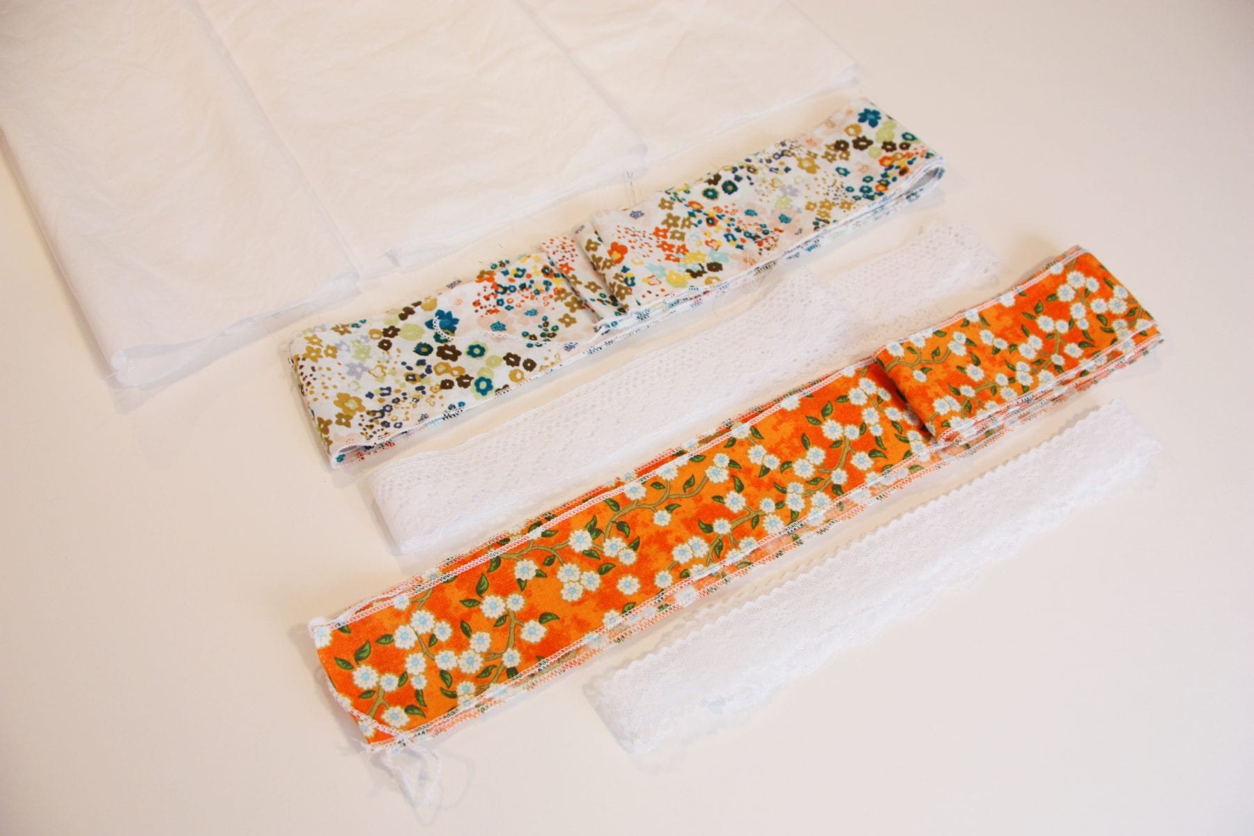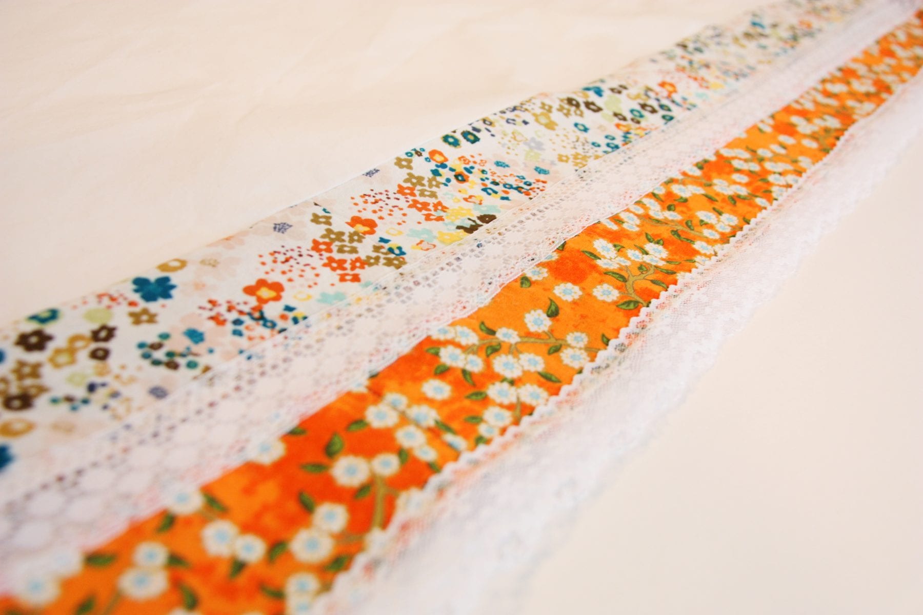 However you do it, you’ll need to select some fabric and some lace to attach to the bottom of your skirt. Make sure to buy strips of lace that are not gathered. It needs to be flat strips of it. Mine came on rolls and I think I found it at a craft store (A.C. Moore?) back in Georgia. But check any fabric store. I chose 2 different lace styles (just for added detail) that were both about an inch wide. Then I cut some strips of fabric that were 2 inches wide and about 6 inches longer than the measurement of the bottom of the the skirt. Make sure and zig-zag or serge the bottom edge of the top strip (white background strip) and the top and bottom edge of the bottom strip (orange background strip). You need to finish off those edges because those are the edges you will be attaching the lace.
