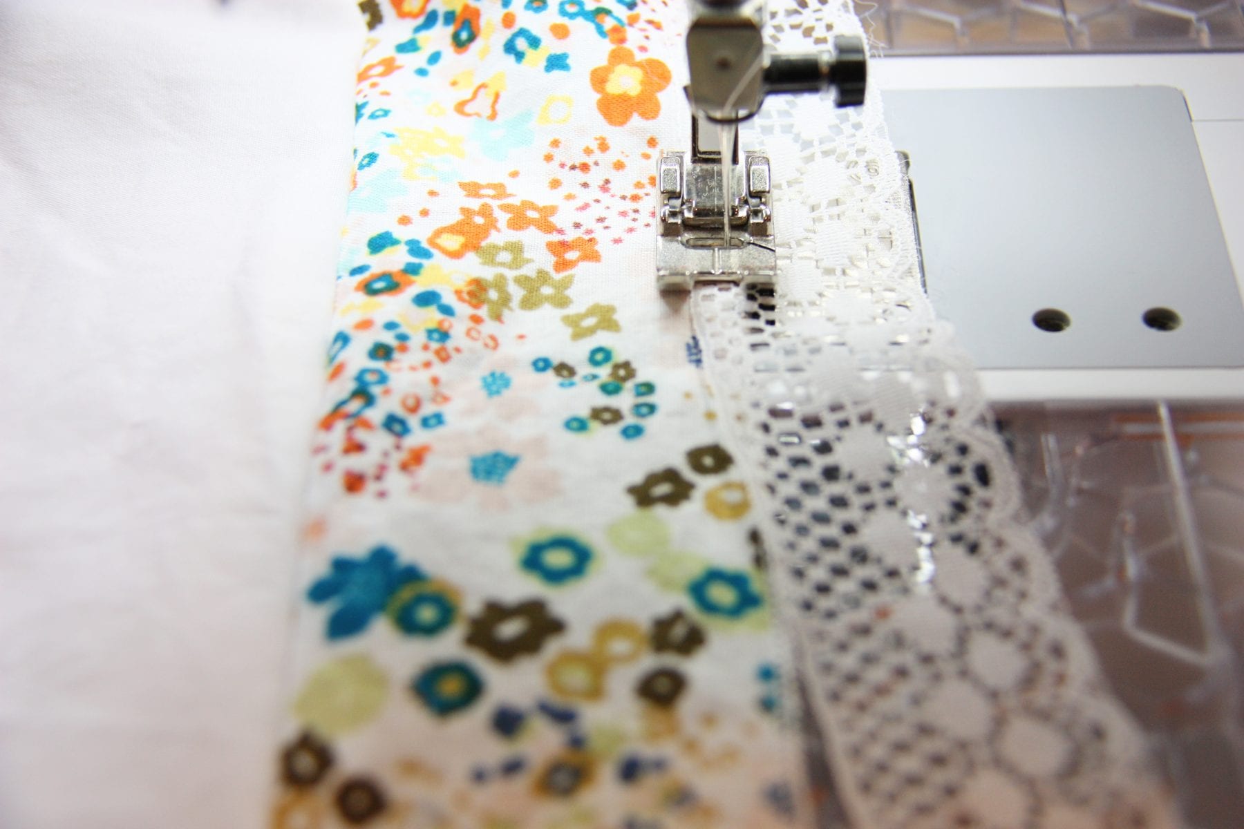 Leave the ends free like above and then sew the two ends together and then finish sewing the lace down to the fabric. Just like you did above with the fabric strip.
