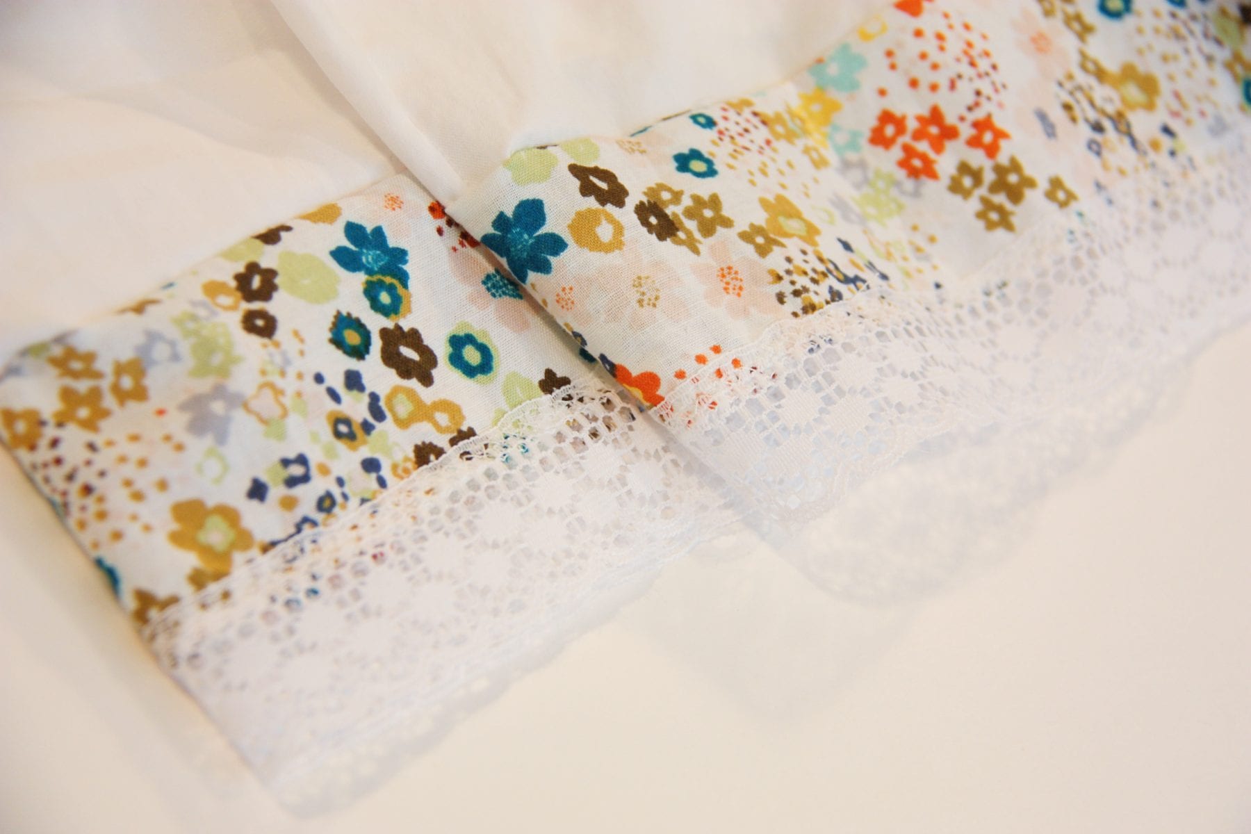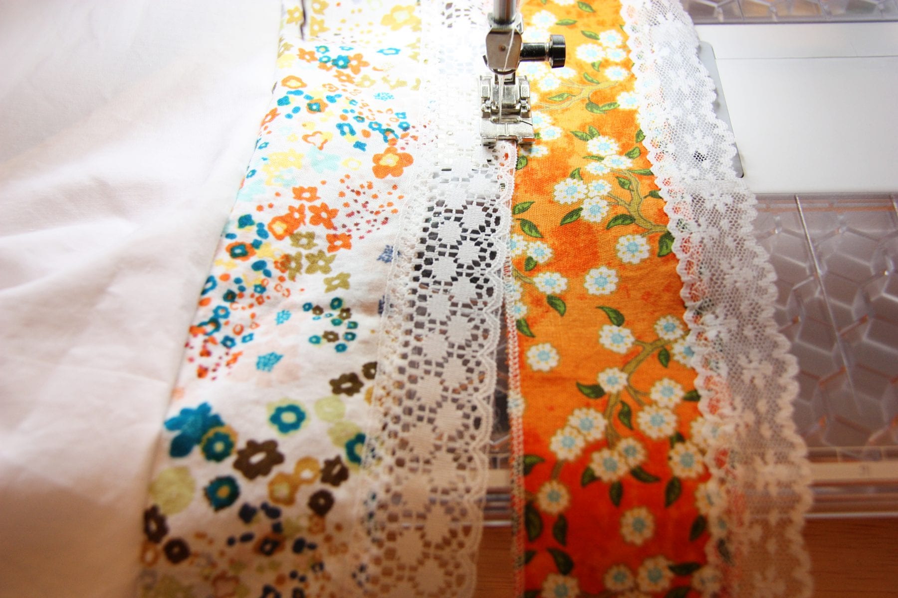 Now, flip that fabric strip down and begin adding your first strip of lace. (Remember that this bottom edge of fabric is serged or zig-zagged.) Overlap the lace on top of the fabric by about a 1/4 inch, and sew in place with a narrow zig-zag.