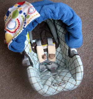 And while your baby is in the car or in the store, just flip the blanket up over the car seat handle…….no need to untie it every time.