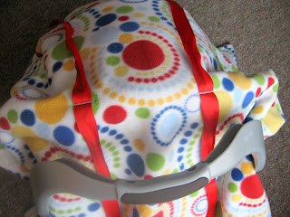 Then measure out 2 pieces of wide grosgrain ribbon, that are about 24-26 inches long (depends on how long you like it). Pin the ribbons to the cover and then place the cover over your carseat to see if the ribbons are in a good spot. Sew the ribbons, down the middle, several times to secure them tightly.