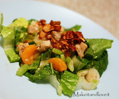 Heat almonds and sugar at medium heat in a small pan. Stir continuously until the sugar has heated through and coated the almonds with a nice caramelized coating. (Don’t worry if the sugar gets all clumpy and seems to not be working. Just keep stirring…..it will melt.) Then spread over foil and let cool completely. Chop up all of the remaining salad ingredients and mix together in bowl. In a cruet, mix in all the ingredients for the dressing. Shake until completely blended. The dressing isn’t soluble so you’ll have to shake again right before pouring over your salad.