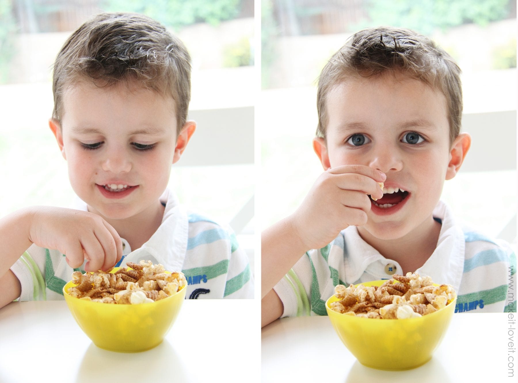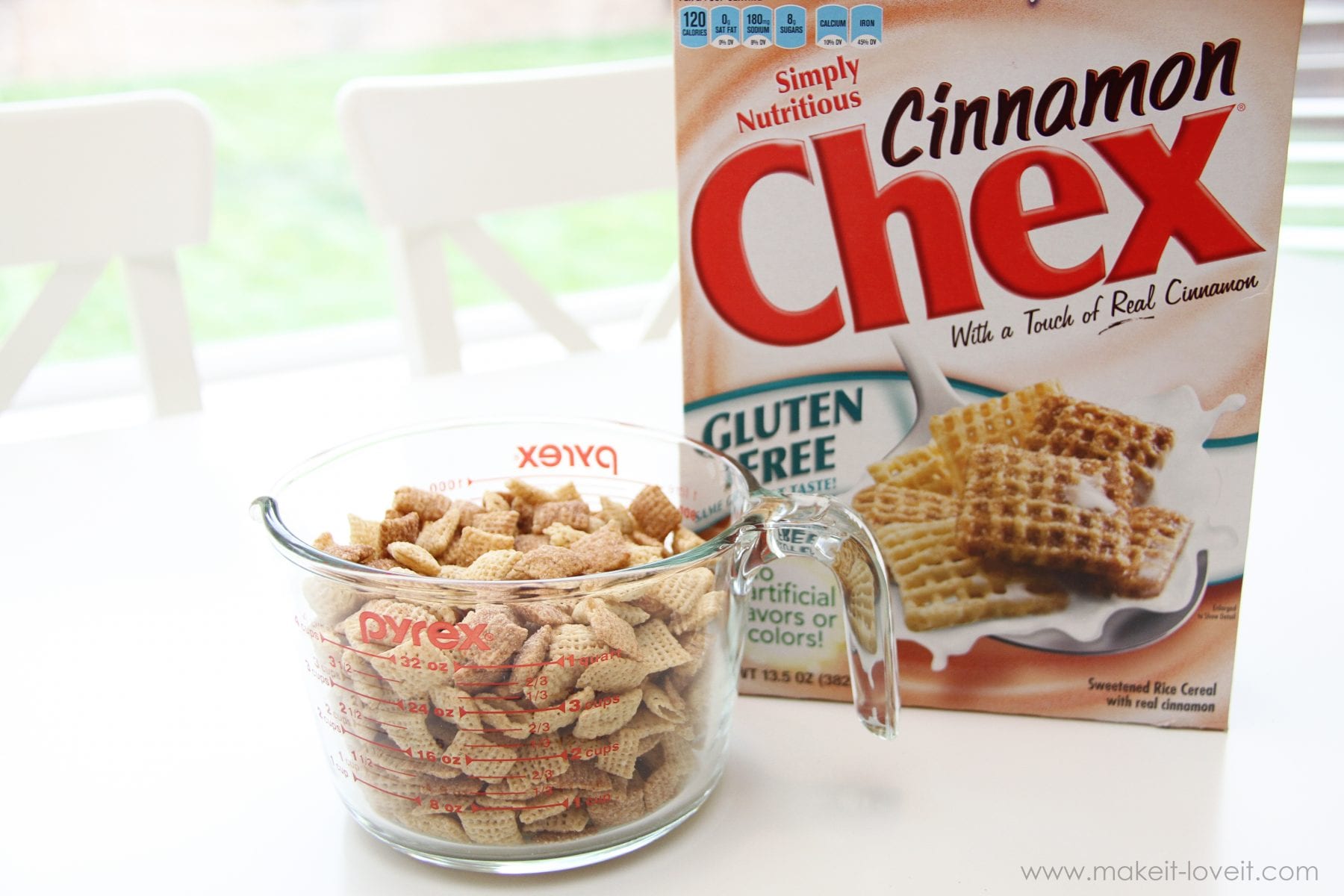 And, Chex has a few flavors of cereal and the cinnamon variety (which you need for the recipe) is delicious. So whatever you don’t use, pour into a bowl for breakfast. Yum. You need 4 cups of Cinnamon Chex.