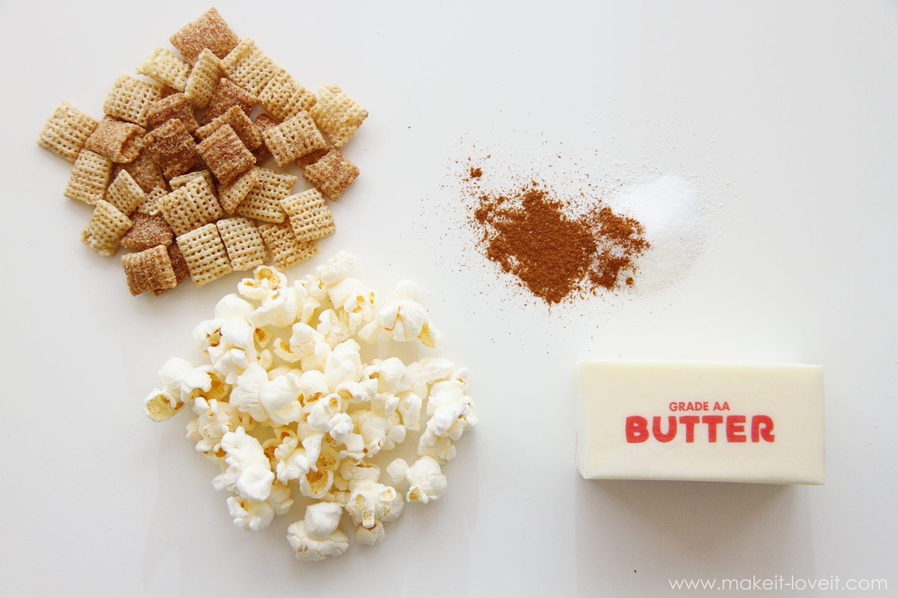 First, all you need is 5 ingredients. Cinnamon Chex, popcorn, cinnamon, sugar, and butter. Easy, right? (And if you’re a nut fan, throw some in. It’s a nice way to add in some protein.)