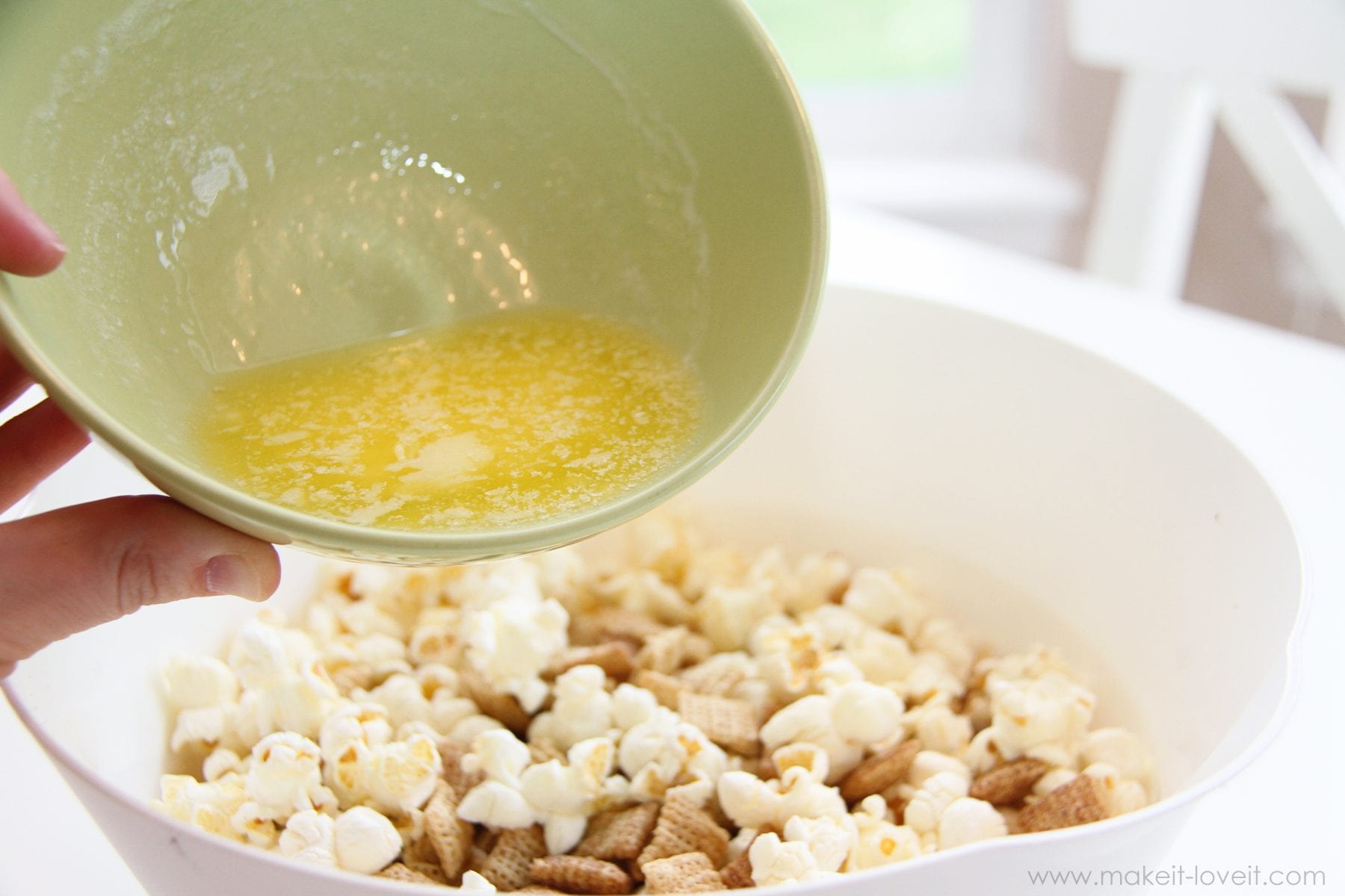 Mix the chex and popcorn in a microwave safe bowl and then drizzle 6 Tablespoons of melted butter all over. Stir your popcorn/chex mixture as you drizzle, evenly coating the mix with your butter.