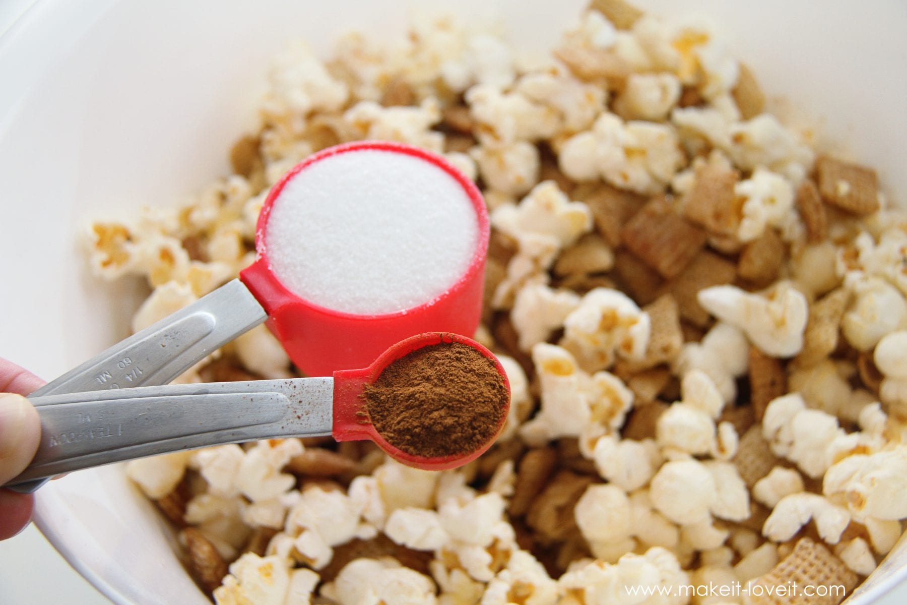 Then, sprinkle 1 teaspoon of cinnamon and a 1/4 cup of granulated sugar over the popcorn/chex mixture, evenly coating it all.