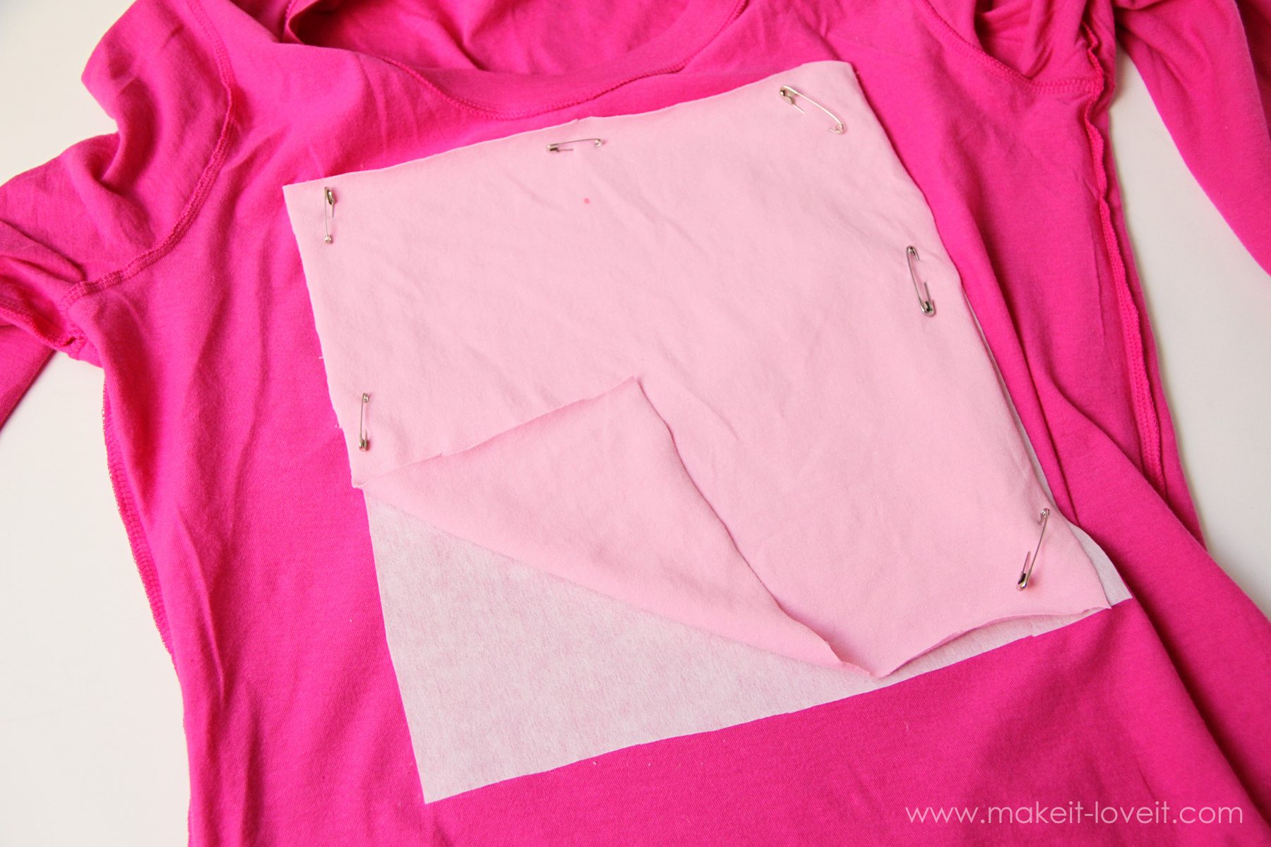 Then turn the shirt right side out again (being careful not to smudge your chalk) and place a piece of lighter colored knit right over the interfacing. Make sure it’s nice and flat and smoothed out (but don’t stretch it) and pin around the edges. You could also use a woven cotton for the backing but keep in mind that wovens don’t stretch and will change the stretchiness of the front of the shirt. But it would still work and would be just as cute. (Just be sure it’s not a see through woven cotton.)