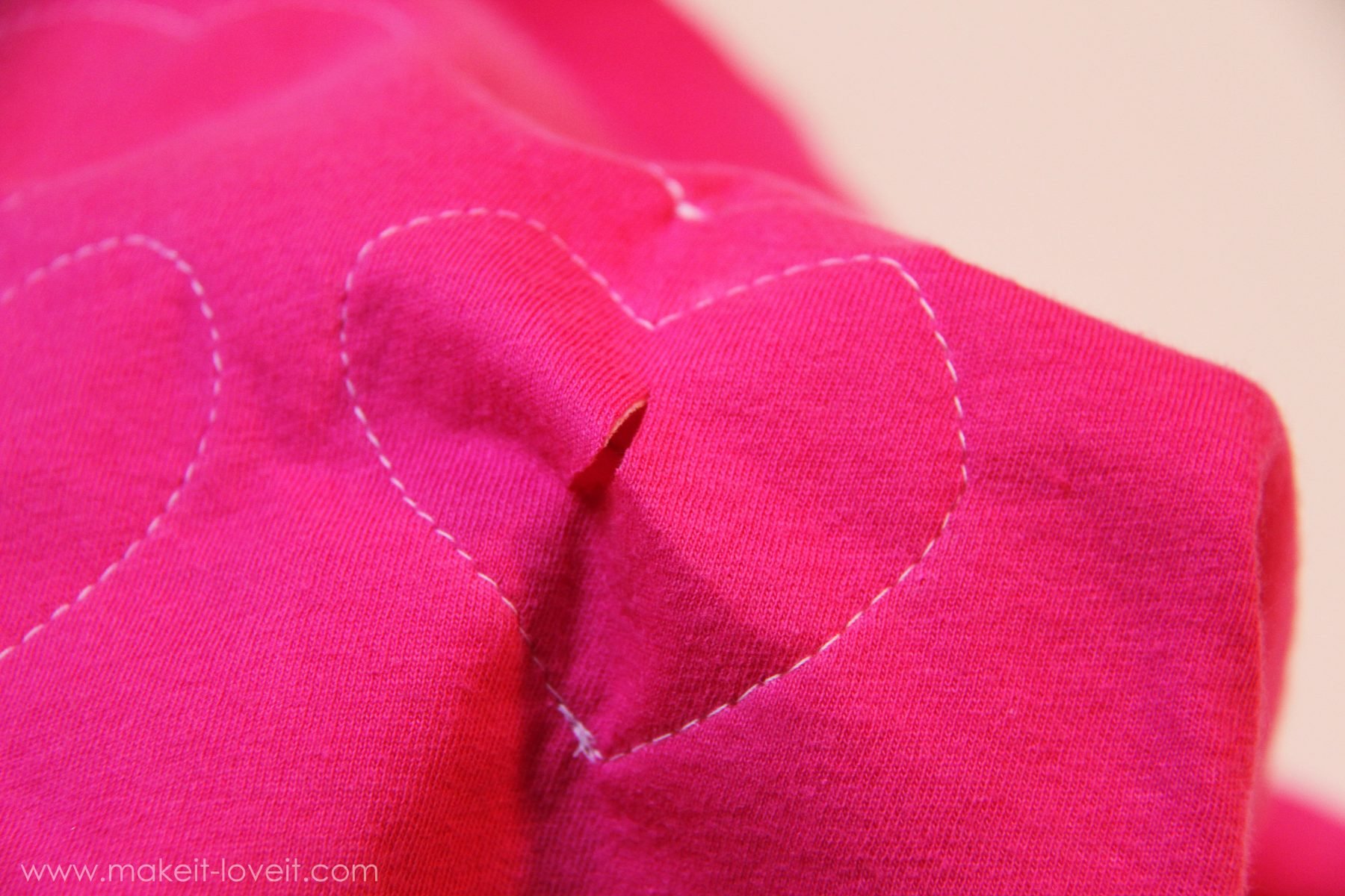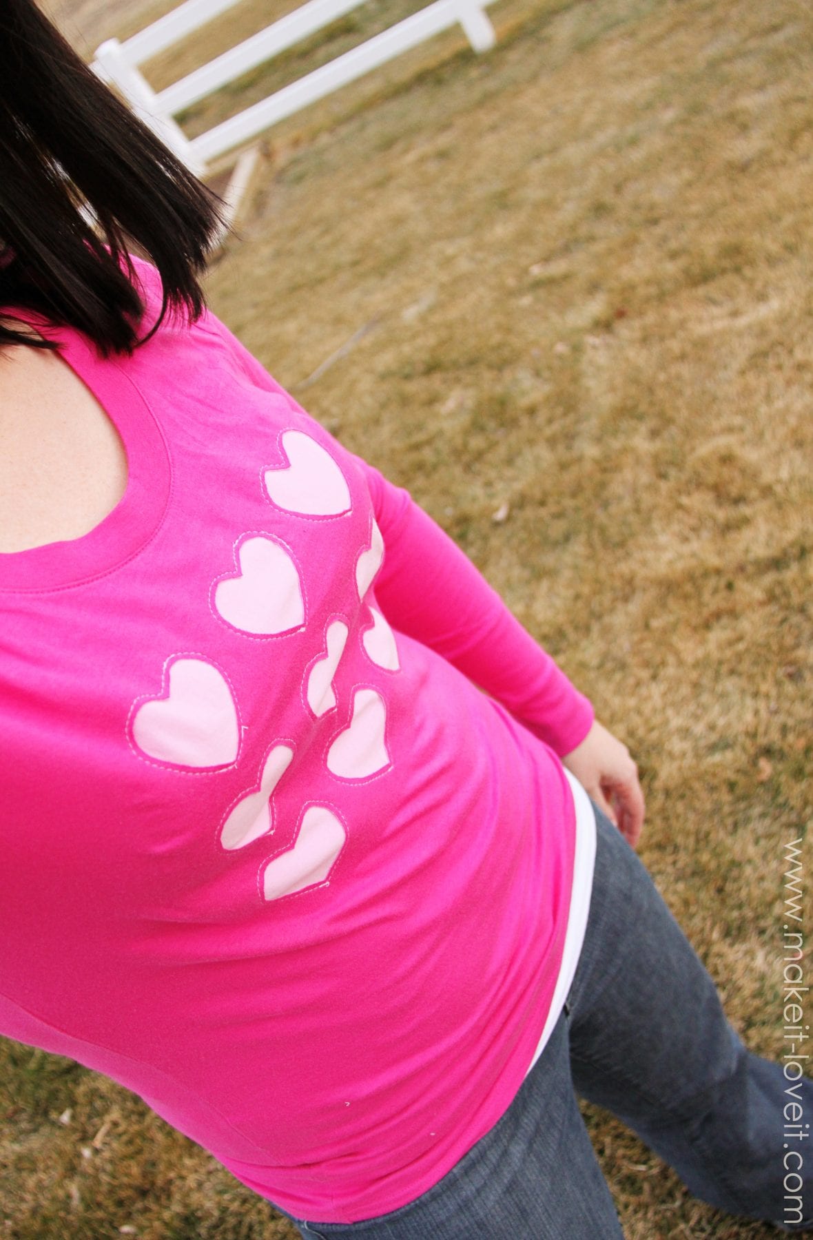 Then turn the shirt right side out again and trace around a little cut-out paper heart 9 times, with chalk.