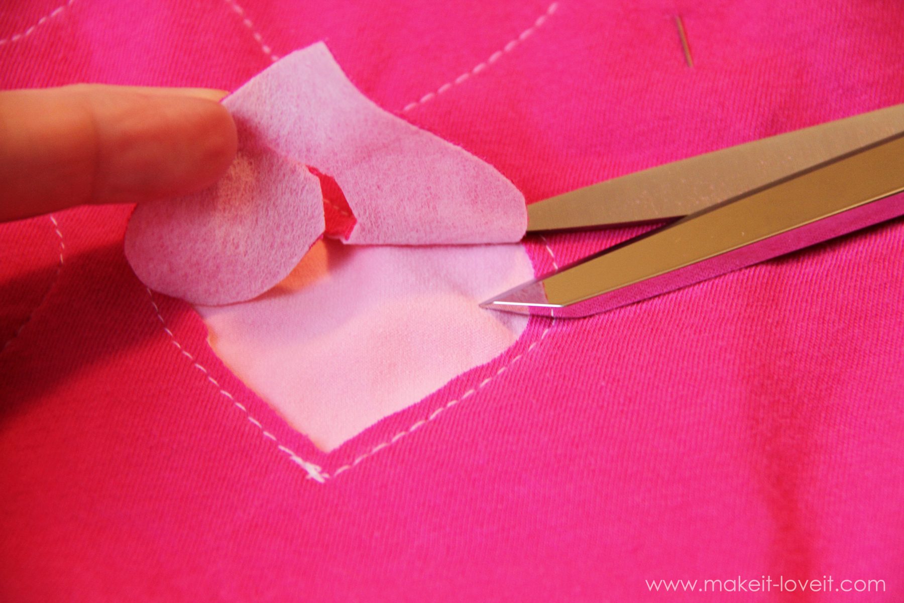 Then turn your shirt inside out and peel back the excess amount of interfacing, if you had any, and trim it away.