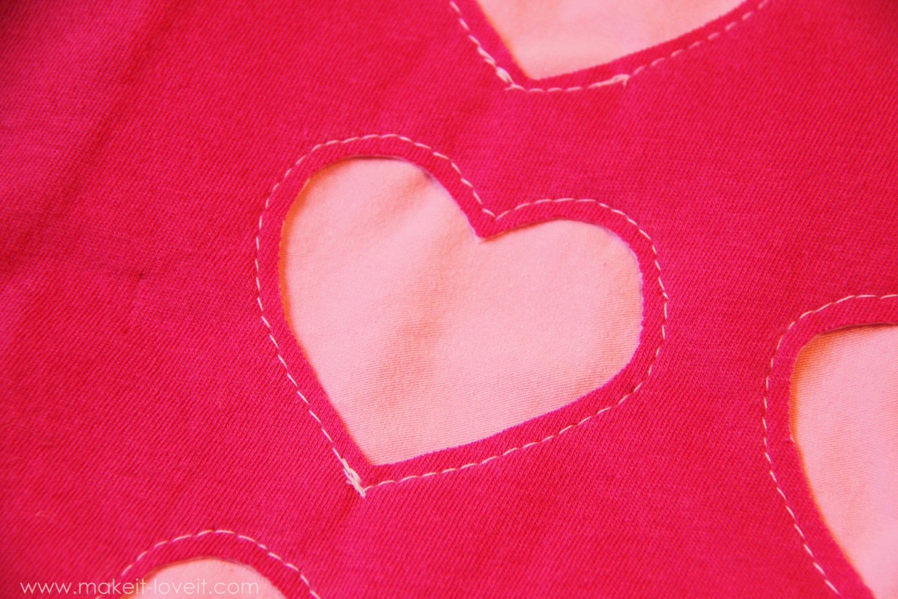 If you look closely, you can see that those little soldier hearts are cut out of the main shirt……..and then they are backed with the lighter pink fabric (one big piece of light pink fabric behind there) and each little heart has stitching all the way around, securing the back fabric right to the shirt.