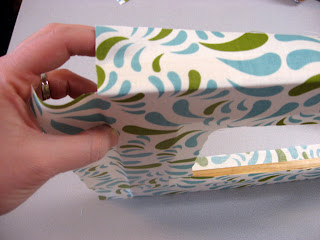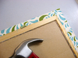 Now, make diaganol cuts into each corner of the inner part of the frame. Apply Mod Podge to the inner frame and smooth the fabric down and tuck it to the back of the frame.