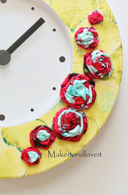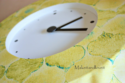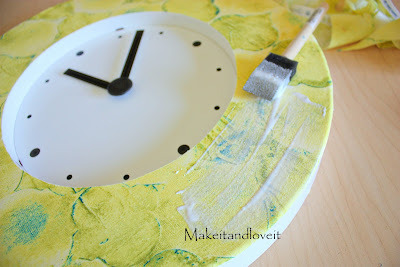 Then apply a moderate layer of Mod Podge right to the clock. Then lay your fabric right on top and smooth out with your fingers. (make sure to line up the fabric with the inner edge of the clock.)