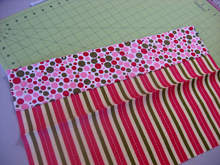Then open up the larger piece of fabric and lay the smaller one on top, matching the two raw edges of the smaller one with the one raw edge of the bigger piece. Sew along that long (21 inch) edge.