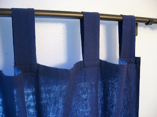Cut strips of fabric that are 4×10 inches. Fold the strips in half, lengthwise, and sew a 5/8 inch seam. Turn the strip right-side out and iron. Do this to all of your strips. (Decide how many you’d like and how many you need to keep your curtains hanging up securely. I attached mine about 12 inches or so apart.) Then turn one end under about a 1/2 inch and attach to the front of the curtain, about 1/2-3/4 inch down. Then fold the other end under about 1/2 inch and attach to the back of the curtain, exactly opposite of the first end. Then make another seam close to the top edge, sewing together both sides of the loop and the curtain itself. This will keep the loop in place and will help the curtain to hang straight.
